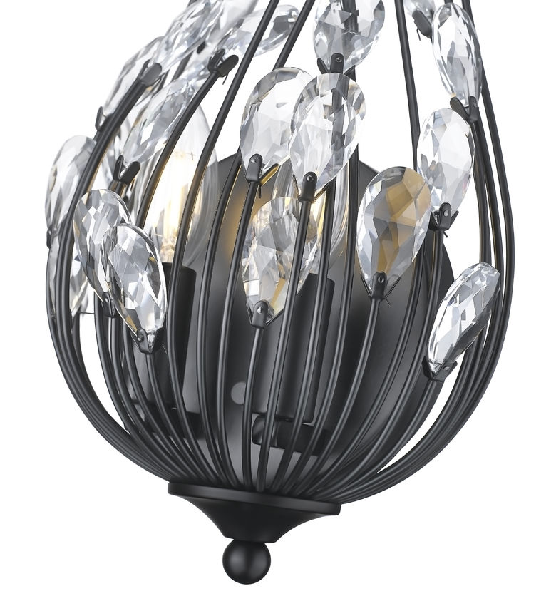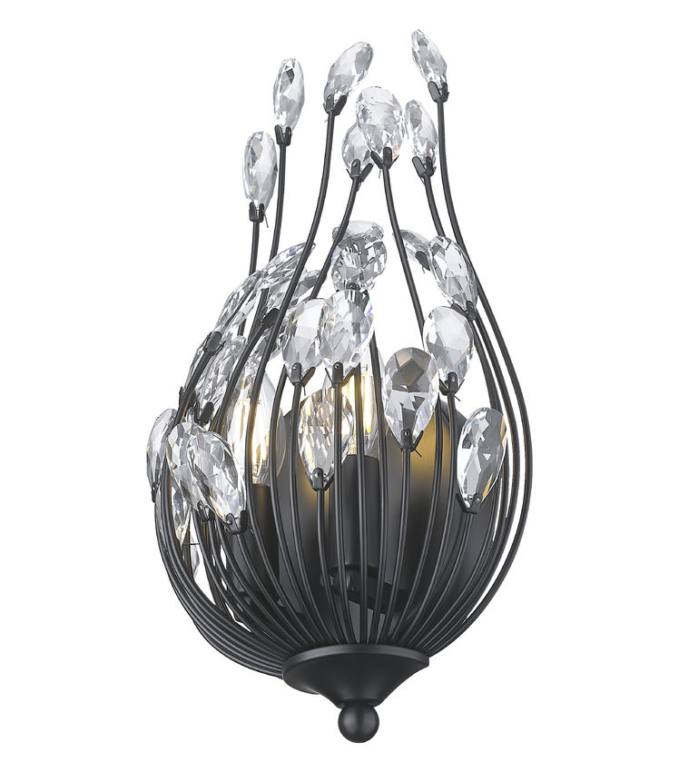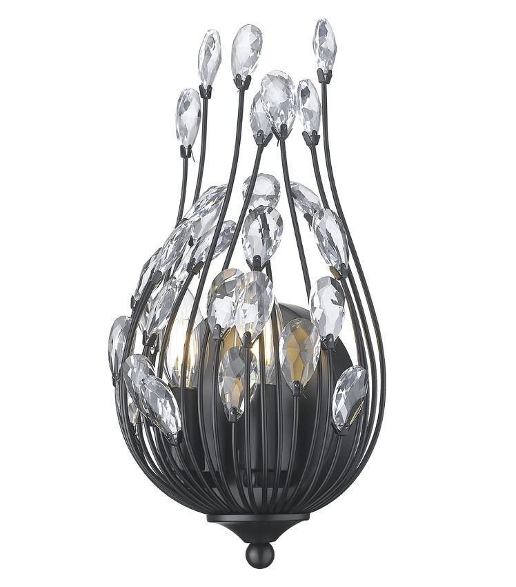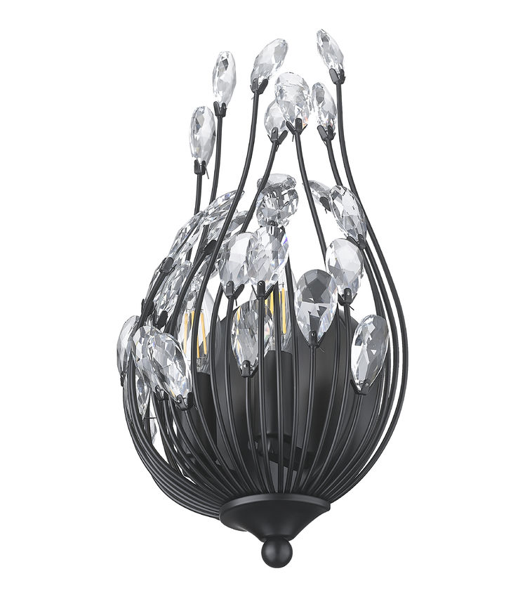 Dramatic matte black finish metal changes the attitude of an organic fixture with a botanical theme. Make this two-light wall sconce a game-changer with its sculpted silhouette featuring delicate stems capped with sparkling crystal elements that illuminate to create elegance.