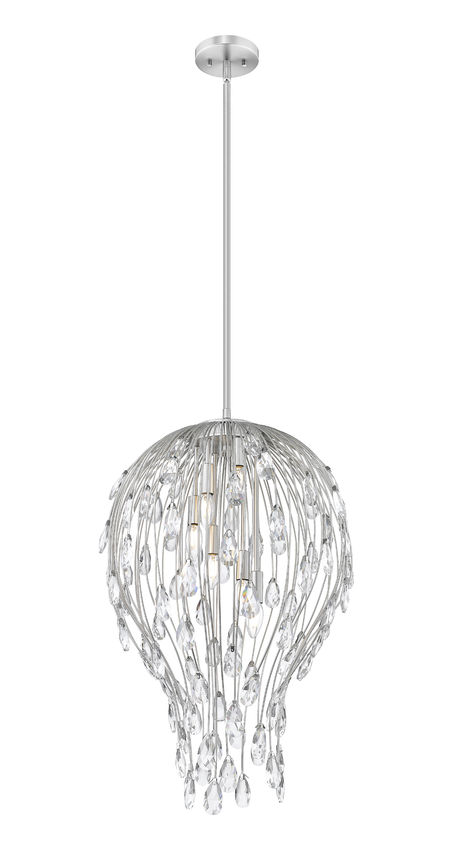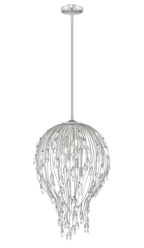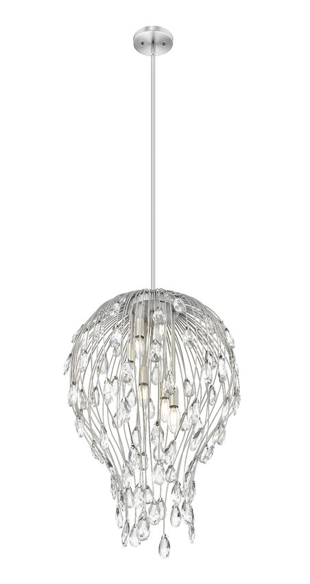 A six-light pendant light offers superb illumination as well as an artisan organic vibe perfect for meeting selective requirements for a dazzling show. This fixture features slender brushed nickel finish metal branch-like rods curving into a center space, capped with sparkling crystal elements to achieve a botanical bud motif. For upscale kitchens, dining rooms, and foyers, this pendant creates a timeless display of elegance.