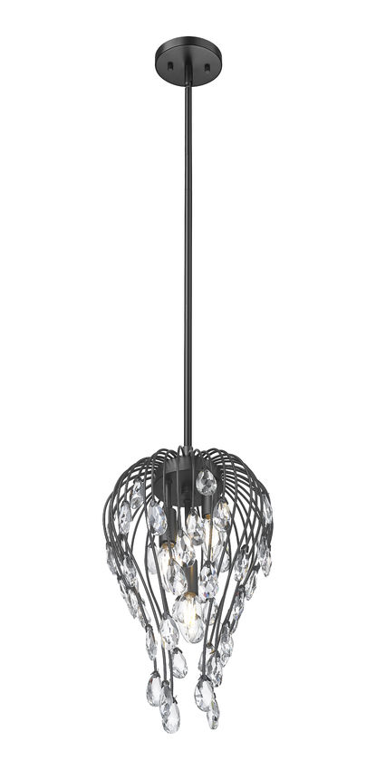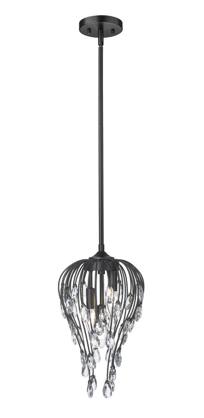 An elegant silhouette showcases open metalwork with a bold matte black finish, softening the organic botanic personality of this three-light pendant light. Bring illumination to smaller settings with a glam fixture and its contoured shape and slender metal rods culminating in sparkling crystal elements. Dining spaces, entryways, bedrooms, and living rooms come to life with this artisan-inspired dimmable pendant.