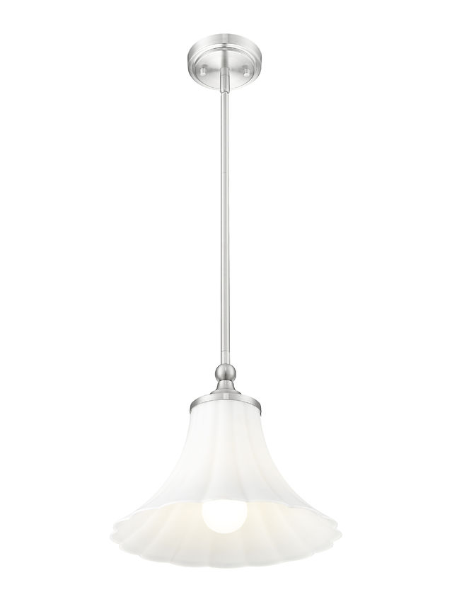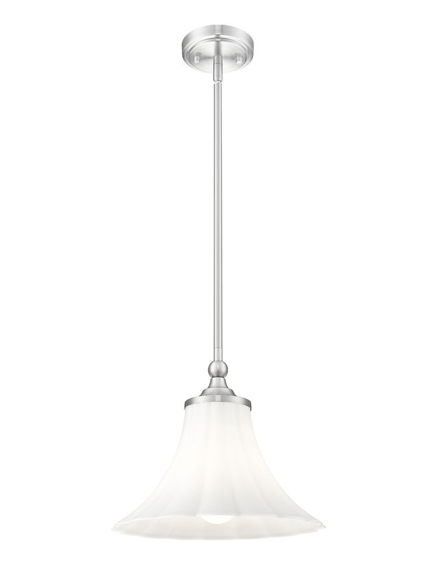 Follow the fluid path of this single-light pendant and appreciate the classic silhouette of a fixture bringing elegance to living rooms, islands, and entryways. With brushed nickel metal framing, its brilliance is both versatile and compelling. A shapely bell shade made of fluted matte opal glass ensures a tasteful design turning minimalism into artistry, with dimmable lighting as a clear bonus.
