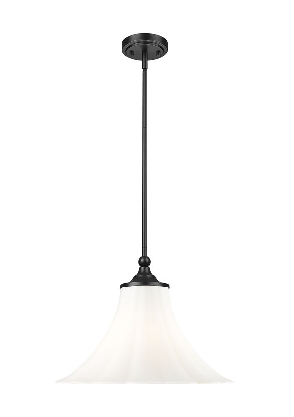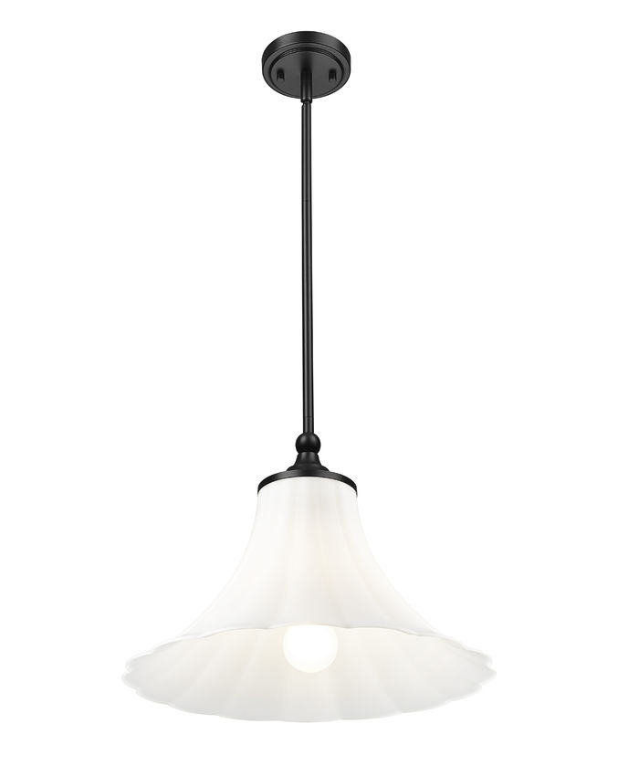 Contrasting tones create a dynamic look in a light fixture showing off timeless aesthetics. This single-light pendant delivers a chic look with its matte black finish metal frame dressed up with subtle detail, and a lush, delicate matte opal glass fluted shade becoming a prominent decor element. Bring beautiful style and dimmable accent lighting to bedrooms, hallways, foyers, and living rooms.