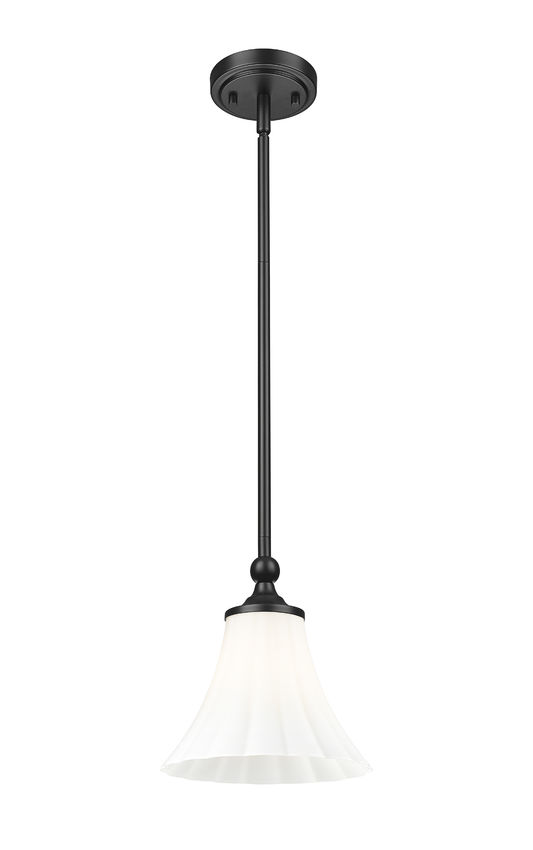 Timeless beauty calls on a simple design in lighting as this single light pendant blends glass and metal to create a tasteful look. A shapely fluted matte opal glass shade glows with dimmable lighting, capping a bold matte black finish metal frame creating notable contrast.