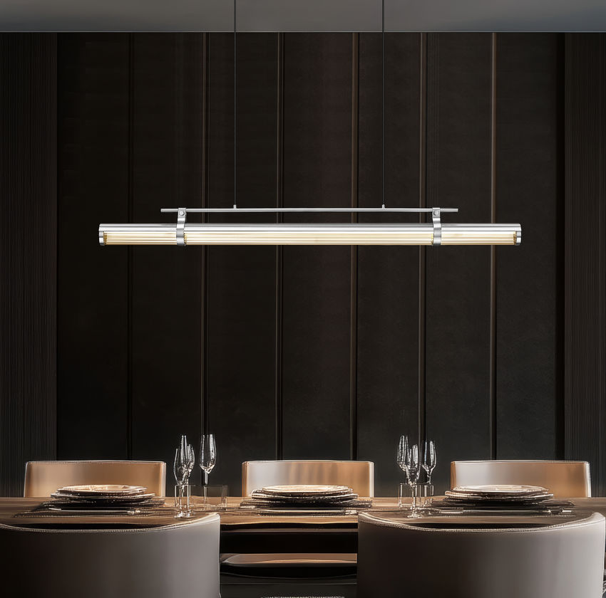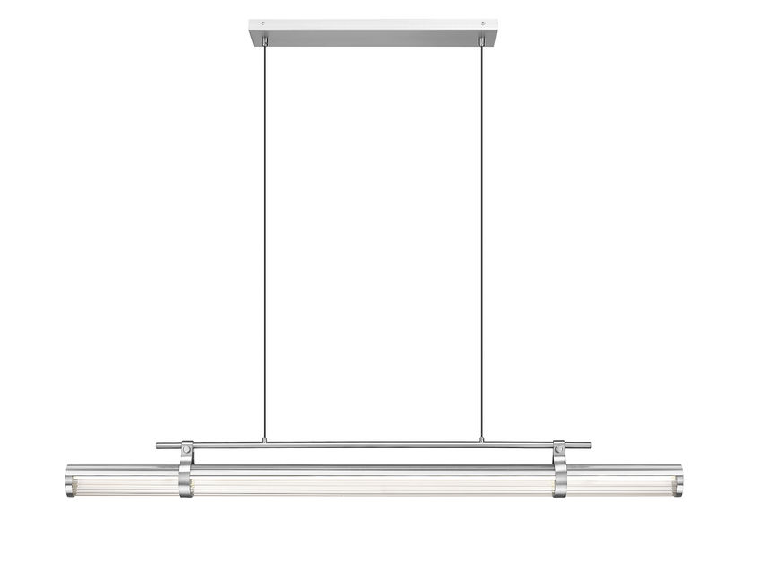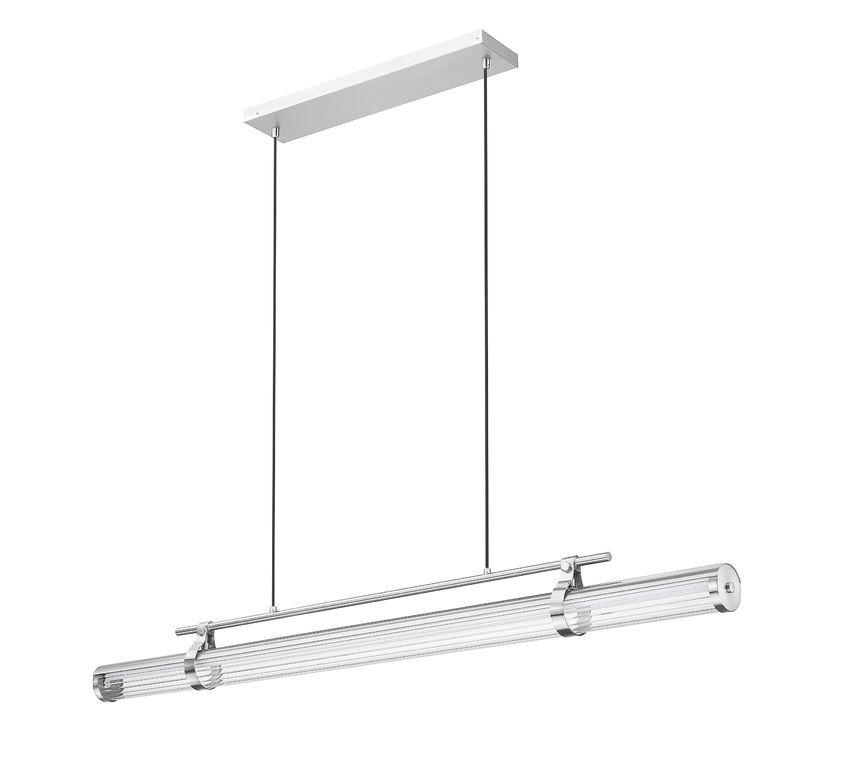 Ornate artistry transforms a classic look of industrial design as this one-light linear chandelier reflects both aesthetic beauty and precision performance. Framing of brushed nickel finish metal follows cable suspension in an LED luminaire meant to enchant, with dimmable lighting and a clear reeded glass cylinder shade offering variable color lighting levels.
