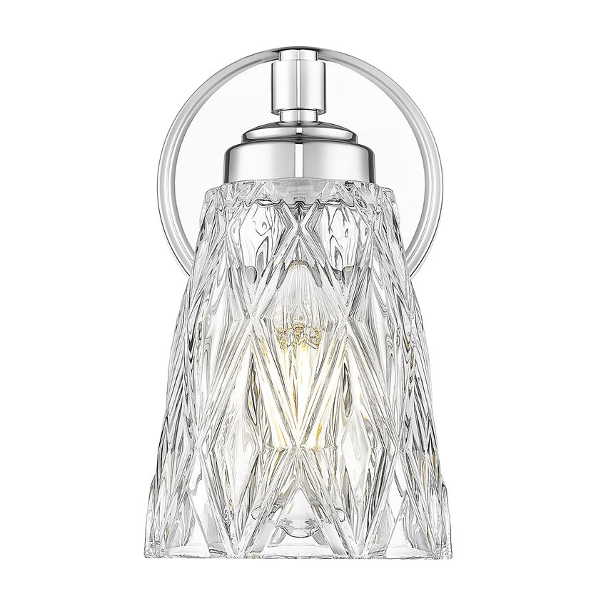 Perfect for a master or guest bath space, this one-light wall sconce reflects glam design and materials as it offers accent lighting with dimming options. Textural diamond patterning on clear glass creates a conical shade, with a brilliant chrome finish metal frame delivers intriguing detail. This fixture will add a luxe look to any space.