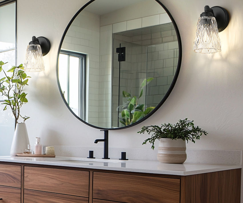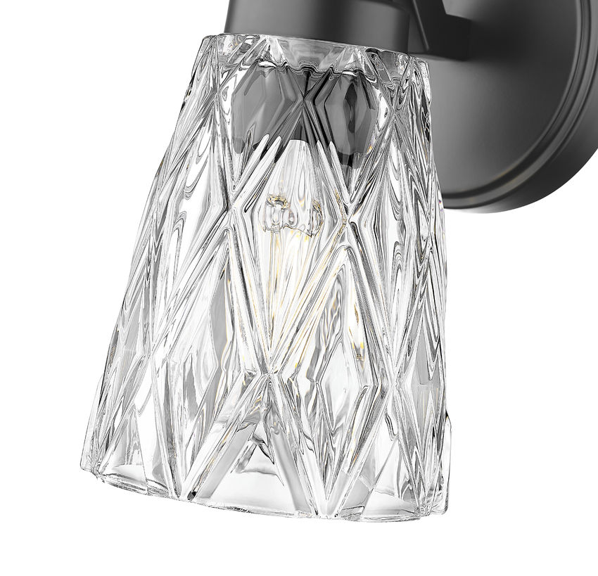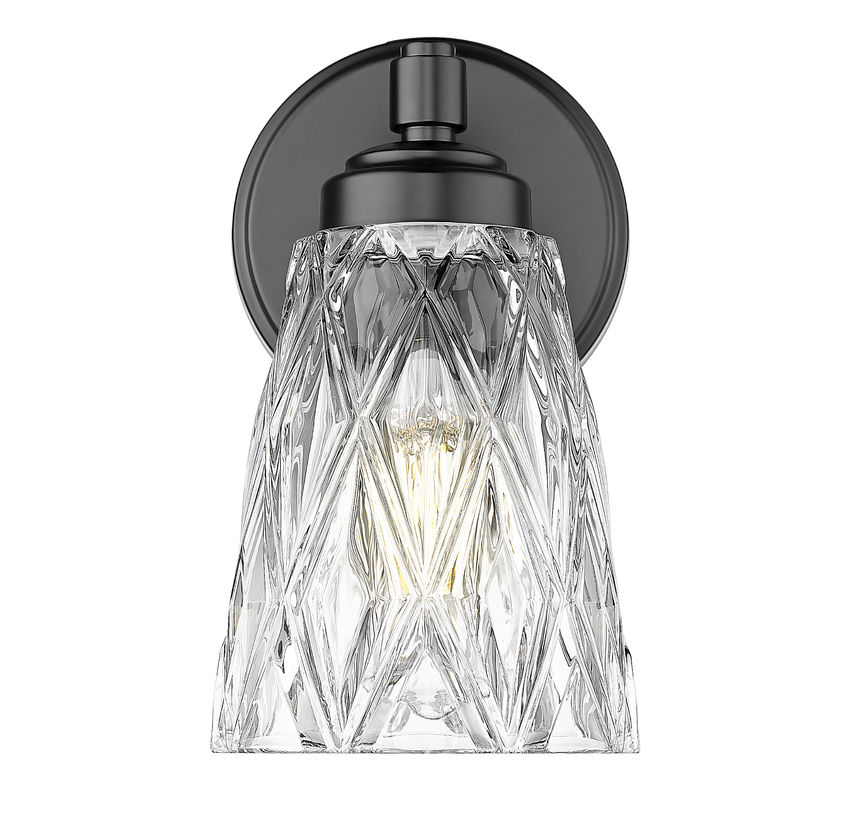 Illuminate a master or guest bath space with this glam one-light wall sconce. Focused on detail, its conical shade features diamond patterning over clear glass, filtering dimmable illumination. A matte black finish metal frame adds stylish detail, a great choice for both bathroom settings and living spaces.