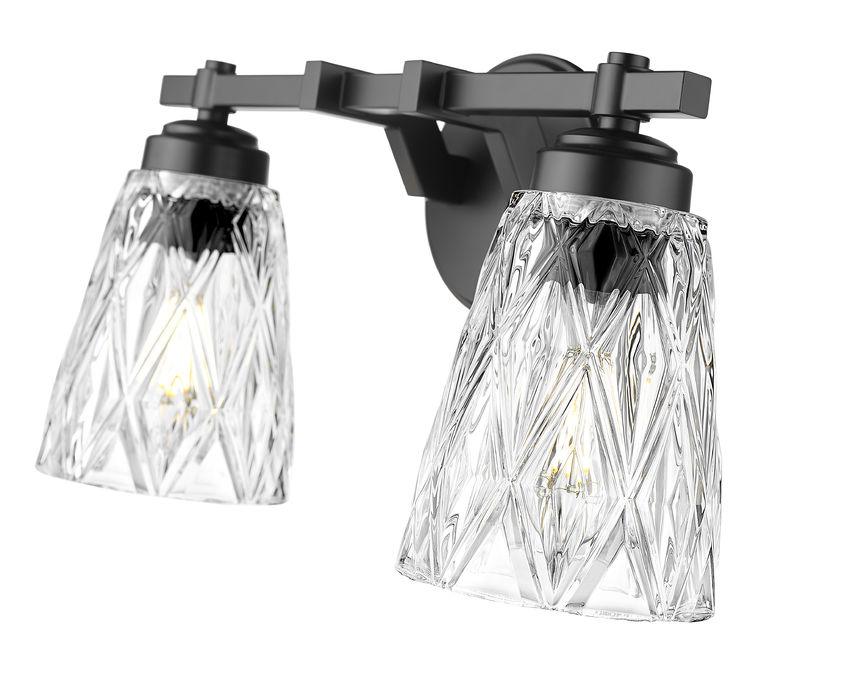 Embellish master or guest bath spaces with a high-class look in this two-light vanity light, a timeless reflection of glam style. Diamond patterning adds texture to a pair of clear glass shades, filtering dimmable lighting that adjusts to custom needs. Decorative matte black finish metal framing creates a sophisticated look ideal for both bath spaces and outer living areas.