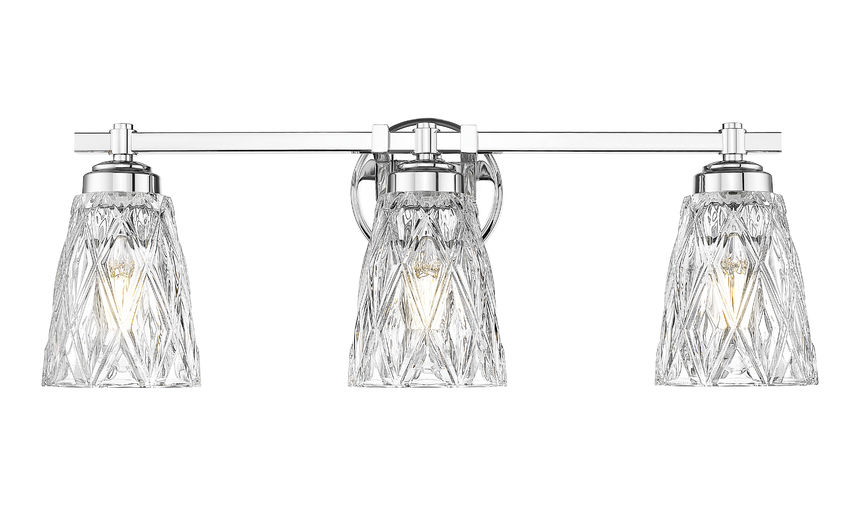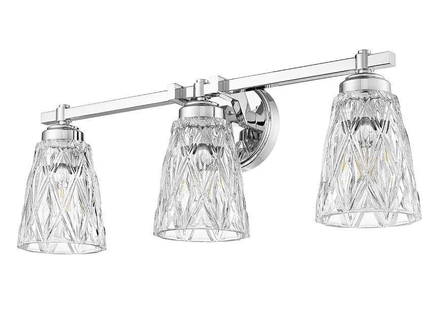 Brilliant chrome finish metal framing offers a radiant element to this glam-inspired three-light vanity light. Update master and guest bath spaces with a beautiful fixture sending warm illumination through textural overlapping diamond patterning on its clear glass shades, bringing a luxe look. Dimmable light levels are perfect for customized lighting throughout the day and night.