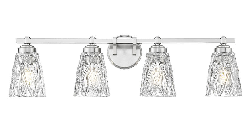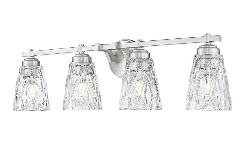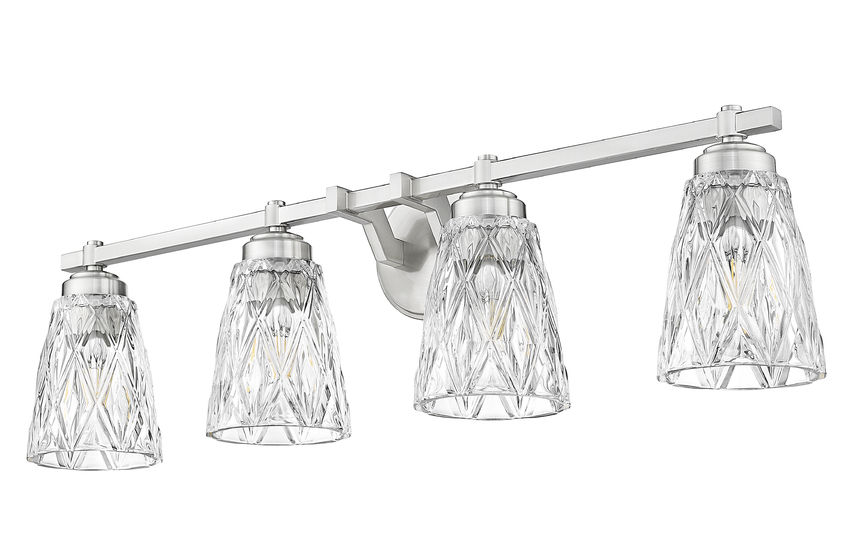 Highlight a wide or dual-sink vanity with this glam-inspired four-light brushed nickel metal vanity light, a perfect choice for master or guest bathrooms. Embrace the textural character of thick, clear glass conical shades with overlapping diamond patterning. Plenty of dimmable lighting makes this enticing fixture irresistible for bathrooms and dressing areas.
