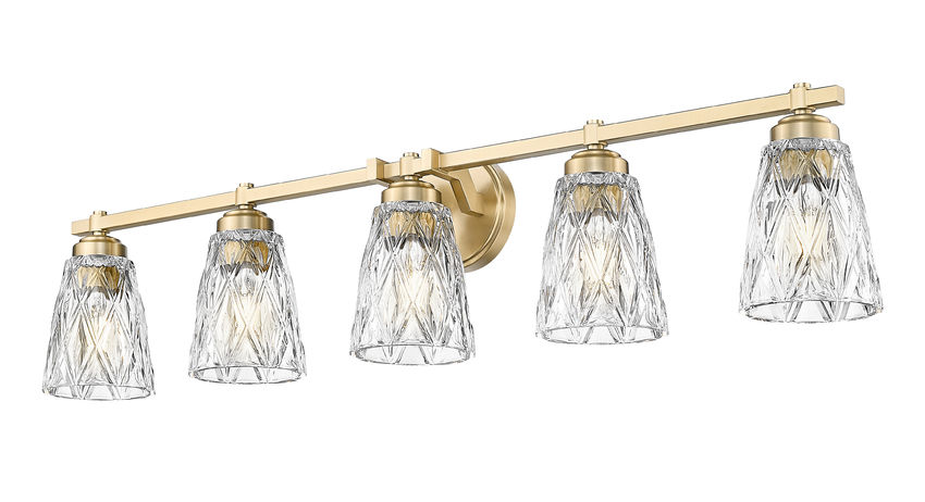 The timeless blend of glass and metal comes to life in a five-light vanity light that becomes an irresistible source of illumination in master and guest bath settings. Decadence shows up in warm modern gold finish metal framing that holds thick clear glass conical shades with textural overlapping diamond patterning. A perfect light source for bathrooms and dressing spaces, this fixture will impress.