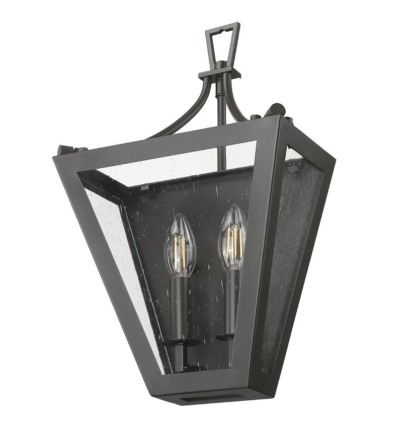 Notable for its unconventional silhouette, this two-light wall sconce is a superb pick for delivering a rustic, exotic look. Its lantern motif features an inverted pyramid shape featuring iron ore finish steel framing with slightly contoured edges and an ornate holder. Candelabra style sockets show off a romantic look as they sit behind slightly seedy glass panels to make a chic statement.