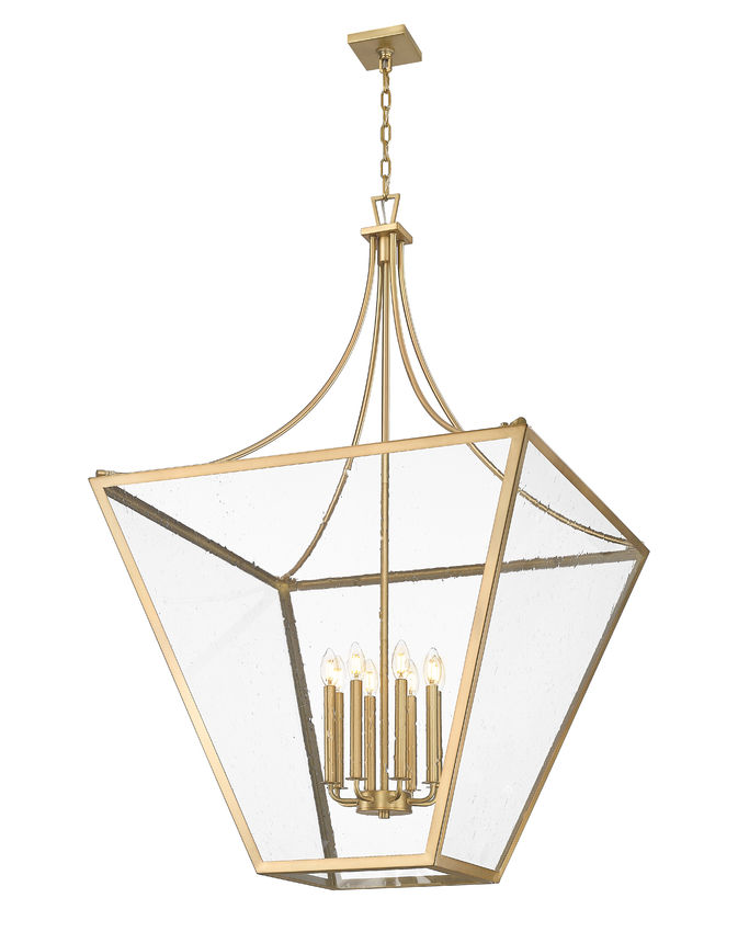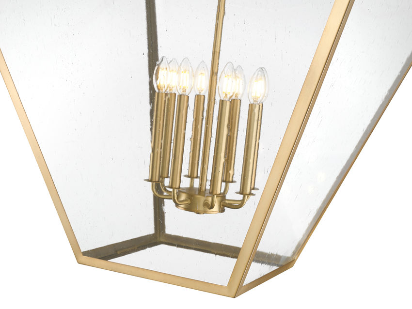 A warm rubbed bronze finish over steel construction creates a lantern-inspired frame, a customized look to an eight-light chandelier designed for larger spaces. Shapely and provocative, its curves and angles show off candelabra-style bulb mounts visible through slightly seedy glass panels. Make this dimmable light fixture a staple for timeless elegance in large living rooms, foyers, and dining spaces.