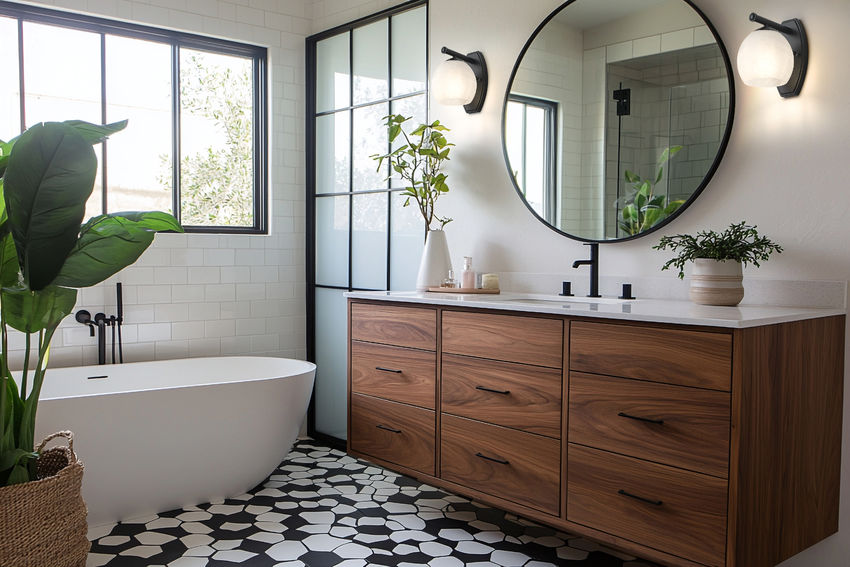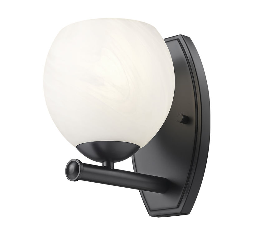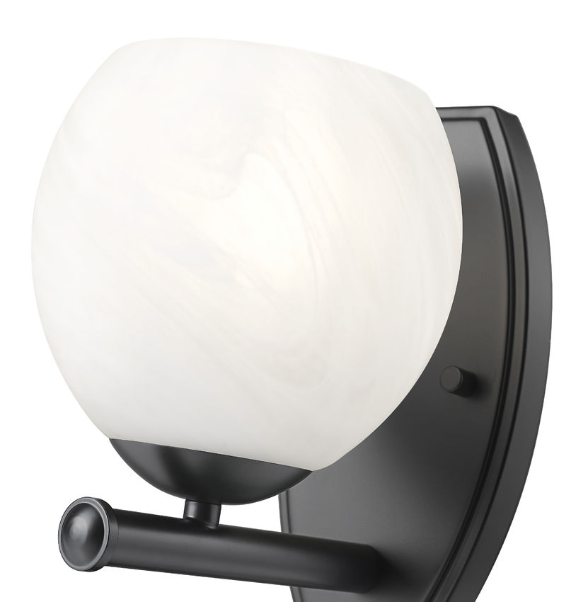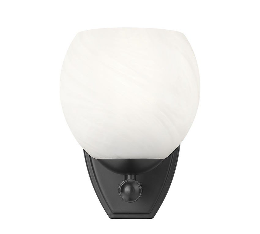 Graceful curves perfectly enhance the sweeping elegance of a transitional one-light bathroom vanity wall sconce. In black, it features a curved wall plate and rounded shade, complete with a feathered opaque white swirl pattern that diffuses illumination. It's the perfect choice for an en suite or powder room, offering bright illumination and timeless style.