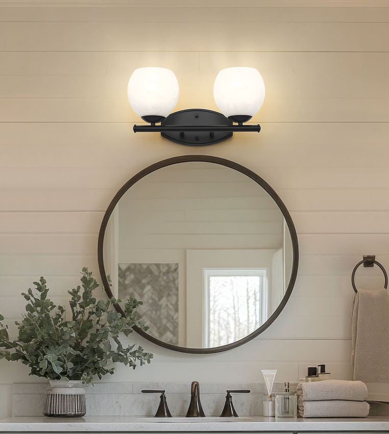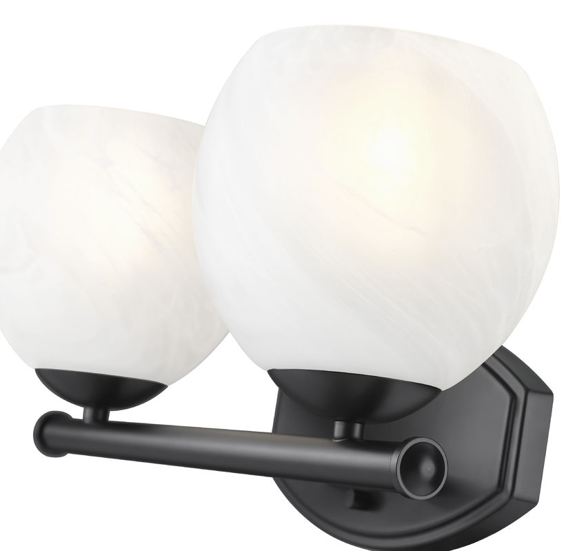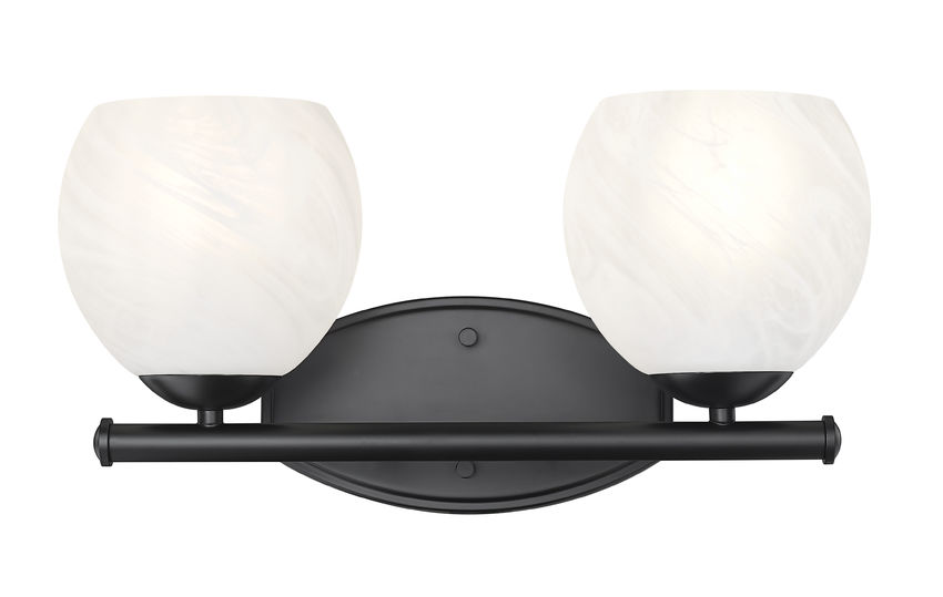 Augment a chic space with the timeless refinement of this transitional two-light vanity bath fixture. In a black finish that emphasizes stylish curves, the light is complete with a pair of rounded glass shades that cast night, diffused illumination. A feathered opaque white swirl pattern adds texture and depth with artisan spirit perfect for primary and guest suites.