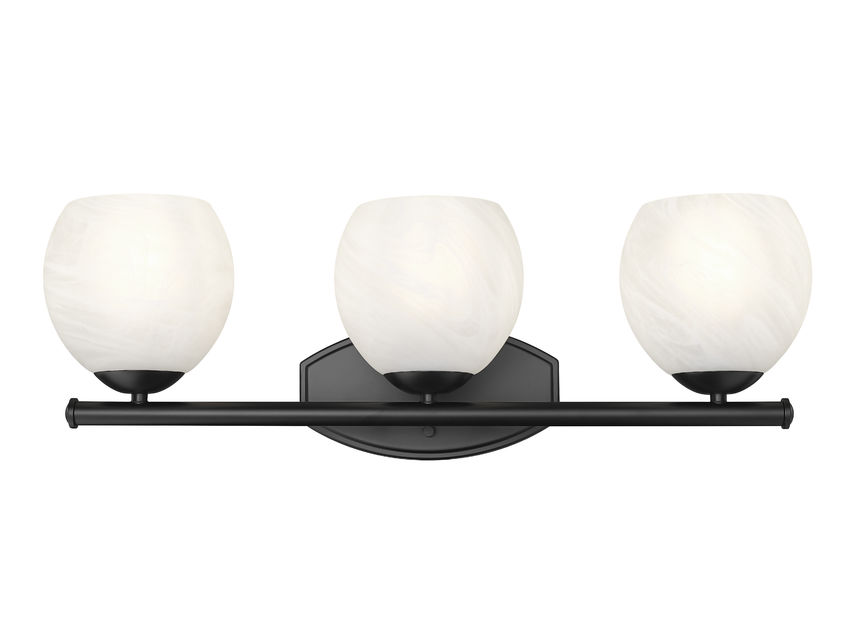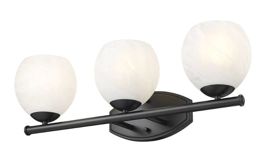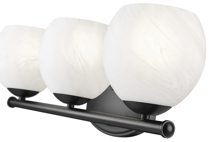 Polished and clean, this transitional three-light vanity bath fixture enchants with its feathered opaque white swirl shades. Each is delicately rounded and perched in a metal cup, creating a refined silhouette over your vanity. A stylish black finish is both on-trend and timeless, delivering refined character in any setting.