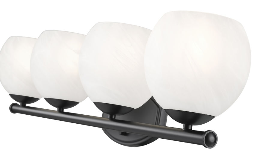 Cool black offers a chic touch of contrast and depth to this transitional four-light vanity bath fixture from the Colette collection. It's a clean, refined design with graceful curves on its wall plate and a straight bar that hosts four rounded shades. Each shade features a swirled pattern in feathered opaque white, ensuring inviting, flattering illumination for all your daily needs.