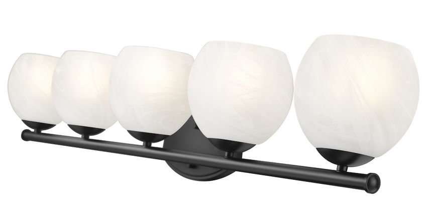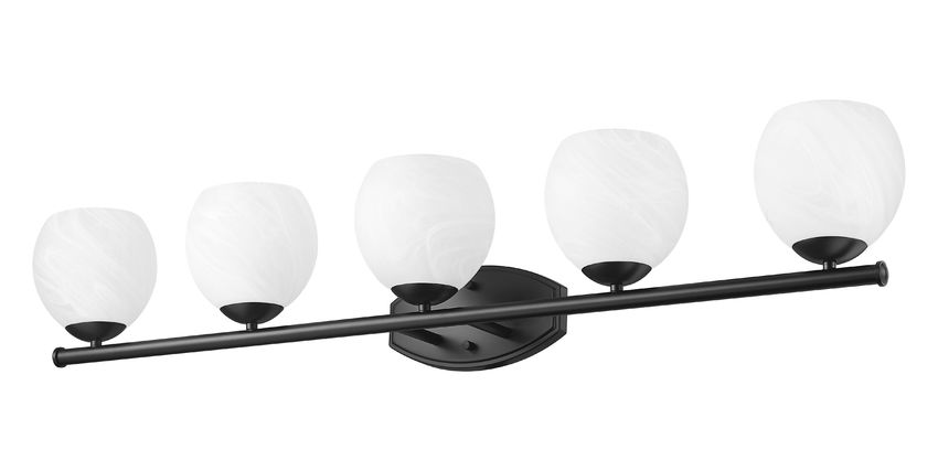 Update a primary or guest suite with the generous illumination of a transitional five-light vanity bath fixture. Its black finish is clean and timeless, emphasizing the gentle curves of its decorative wall plate. Each shade is hosted in a metal cup, and features a rounded silhouette and thick glass with a feathered opaque white swirl pattern that adds subtle sophistication.