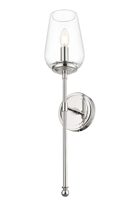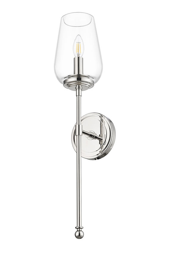 A polished nickel finish frame, which includes a round wall plate and slim stem, gleams in the light of this transitional one-light wall sconce. Beautiful in any setting, it delivers clean, refined delicacy with a clear glass bowl shade inspired by a brandy snifter. Simple and refined, it's sure to complement in any setting.