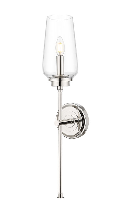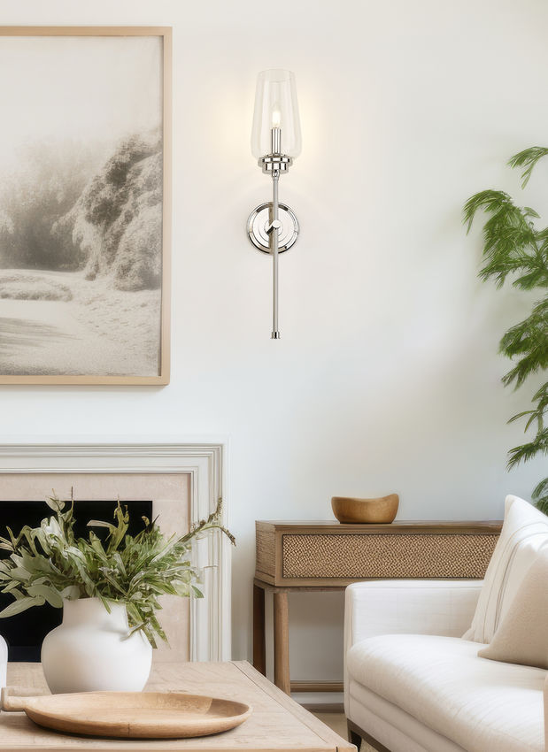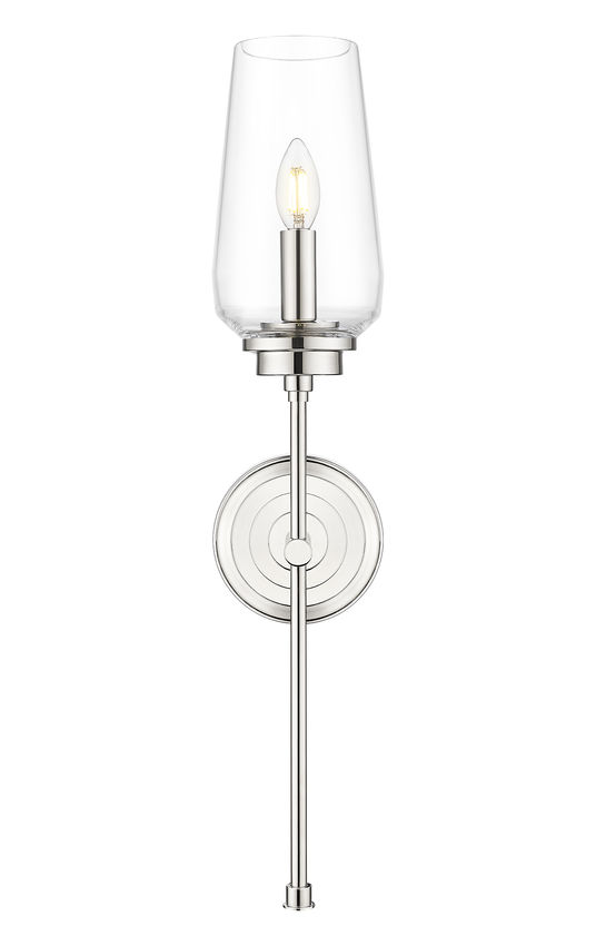 Clean lines and clear glass pair with a polished nickel finish to bring gleaming elegance to this transitional one-light wall sconce. From the Clara collection, it sparkles with refinement, showing off a single candelabra light tucked within a tall, tapered glass shade. A slim stem and stepped wall plate add dimension and depth to this impeccable design.