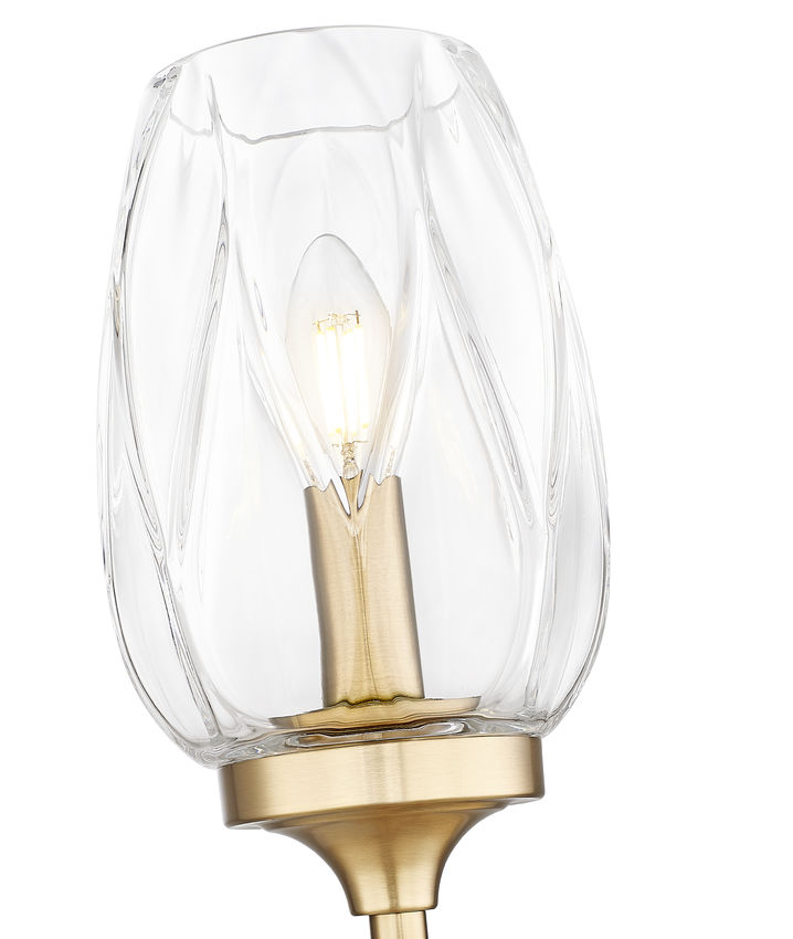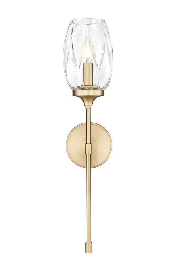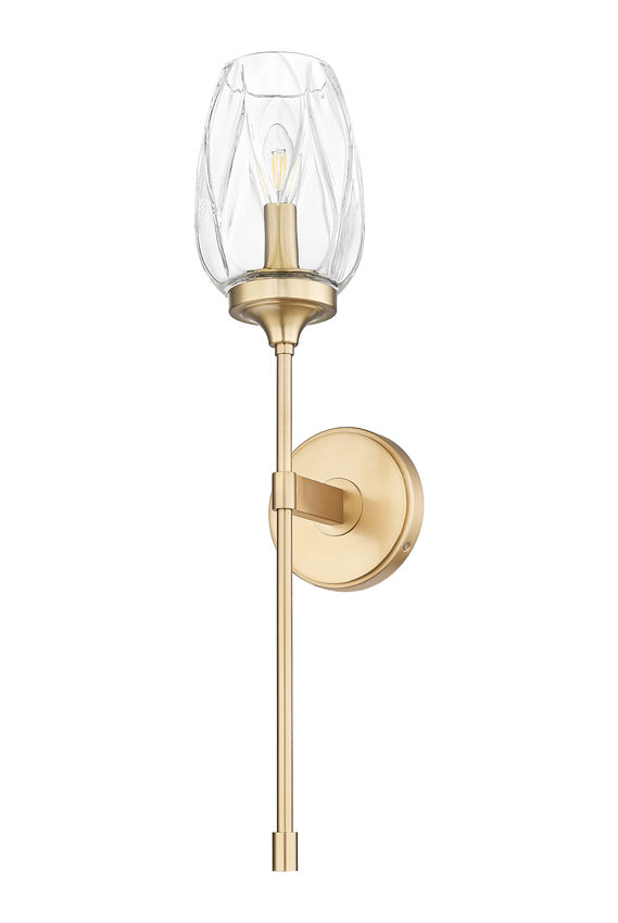 Indulgent warmth radiates from the modern gold finish frame and elegant textured tulip glass featured on this transitional one-light wall sconce. Beautiful in a foyer or living area, it features a sleek silhouette complete with a round wall plate and slim stem that lends drama and gravitas. The delicate taper of its glass shade is perfectly accentuated with subtle patterning that creates a refined, always sophisticated appearance.