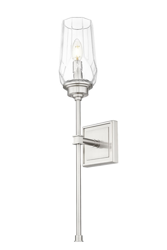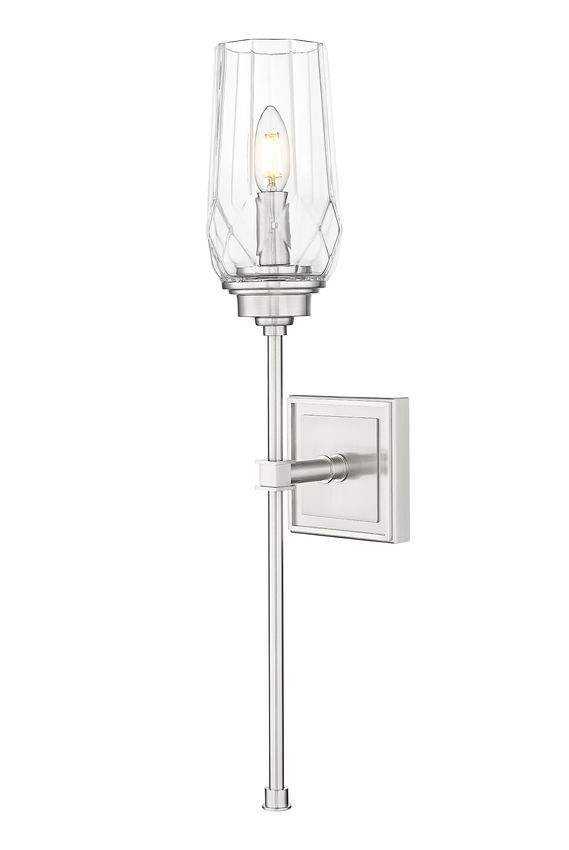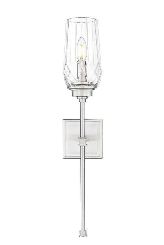 Unique diamond glass lends the perfect dose of sparkle and sophistication to this transitional one-light wall sconce. Its effect is punctuated with a slim stem and delicately beveled square wall plate, adding precision and dimensionality. Add it on either side of a mantel or doorway for added decorative impact.