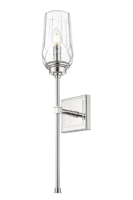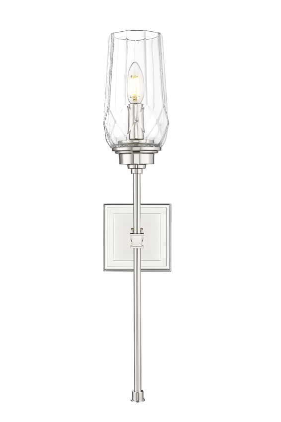 Superb design radiates from every detail in this transitional one-light wall sconce with a unique diamond patterned glass shade. Its polished nickel finish gleams in the light, adding depth and refined character. Beveling adds dimension to its wall plate, while a tall, tapering shade hosts a single candelabra light for inviting ambiance in any setting.