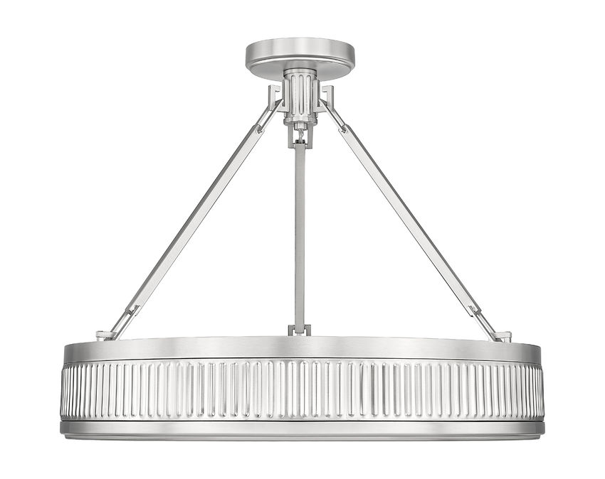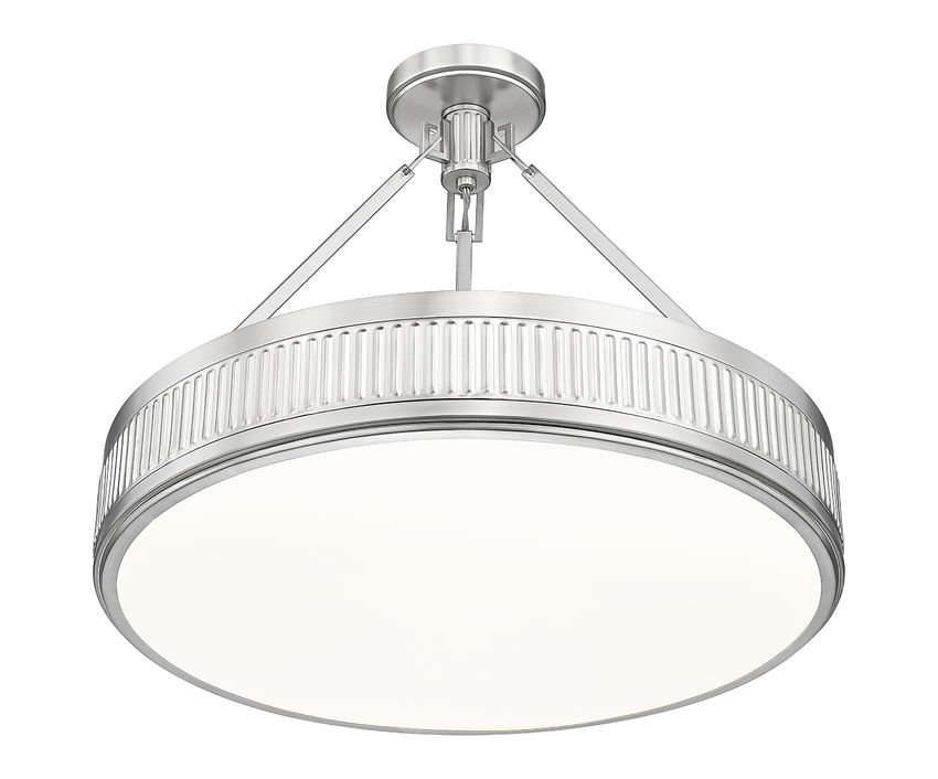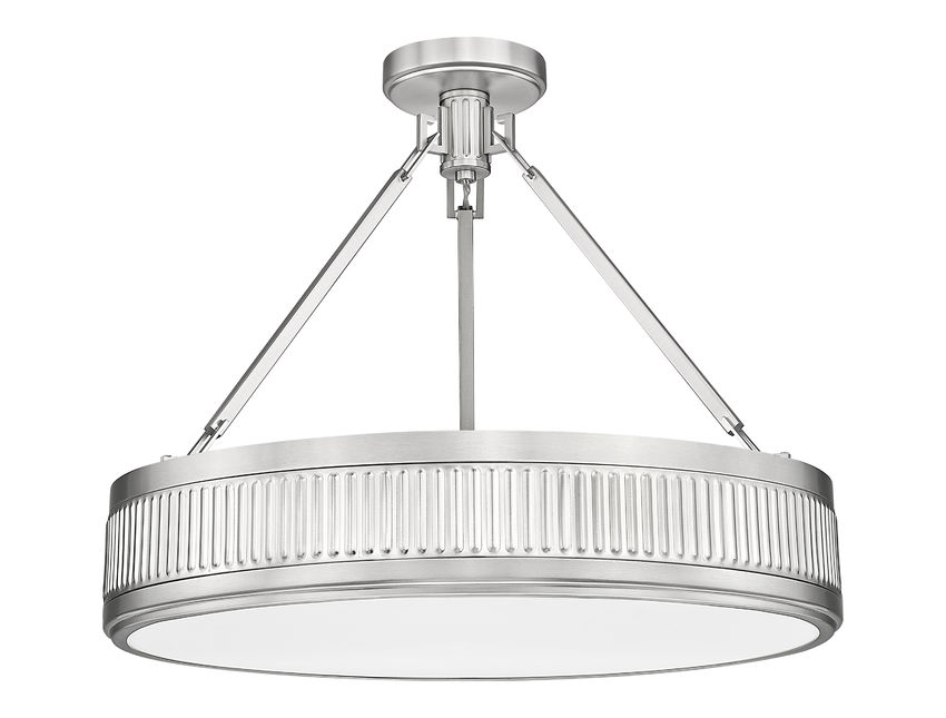 Introduce charming texture and depth with a mid-century modern three-light semi-flush mount ceiling light. From the Quinn collection, it's a charming shallow drum design with fluted band details and a soft satin nickel finish. This fixture is equipped with a Z-Lite EZ change LED module that offers energy efficiency, light color selectability, and dimming capabilities.