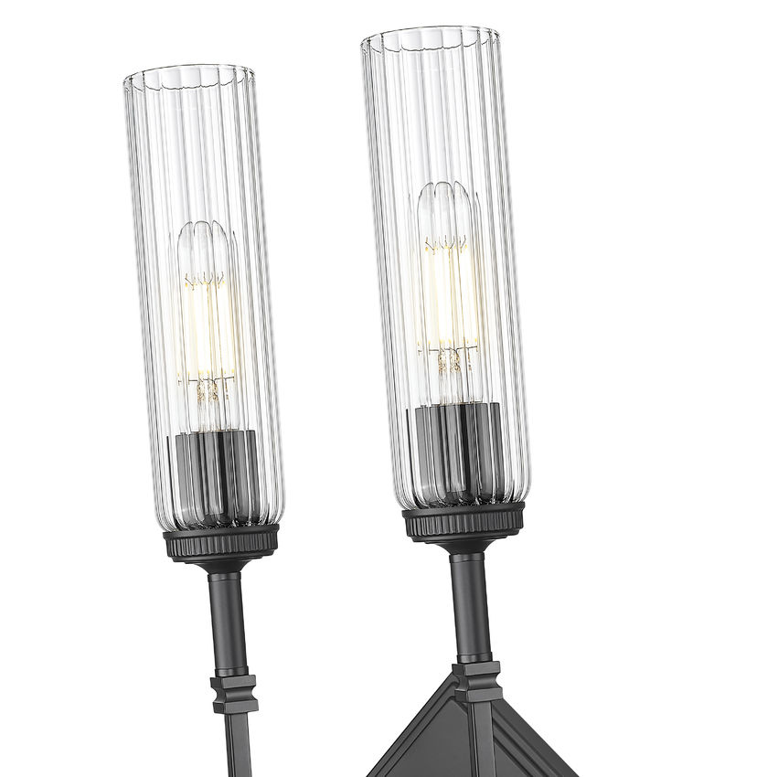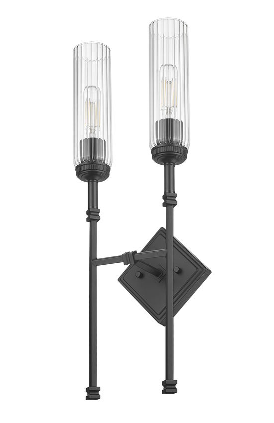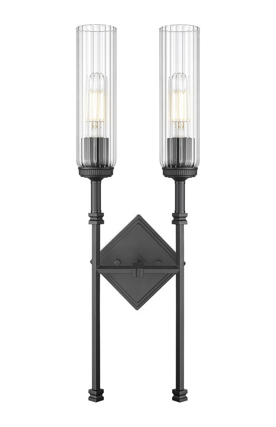 Capture classic charm and timeless elegance with this modern two-light wall sconce. Complete with slim fluted glass, it diffuses illumination to reduce glare and provide wonderful ambiance in your home. Matte black finishing adds depth and definition, while a stepped diamond wall plate and slim stems bring decorative gravitas in living and dining rooms.