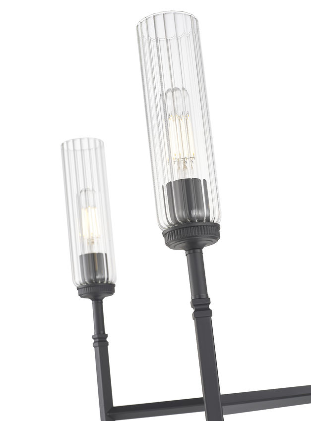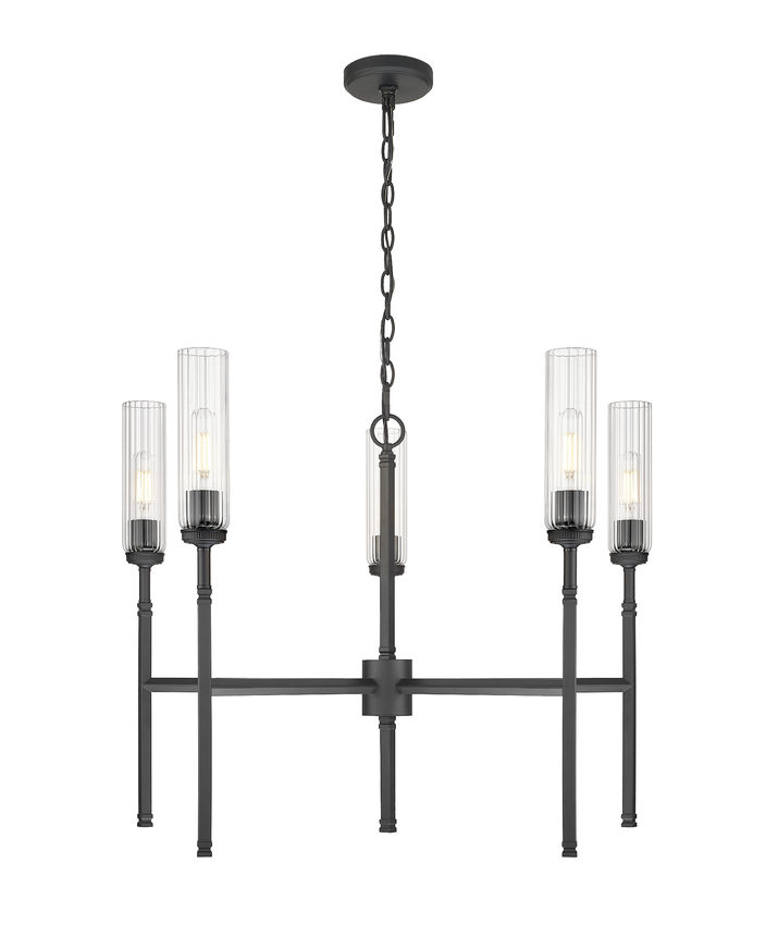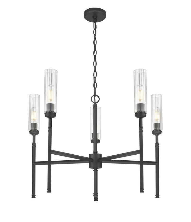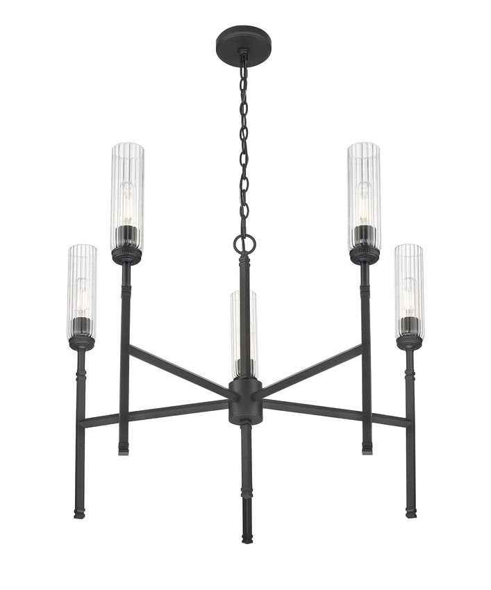 Capture refined ambiance and elegance with an upgrade to this modern five-light chandelier. Slender fluted glass shades perch on slim stems that radiate in a staggered configuration to create a compact silhouette that delivers plenty of illumination. A matte black finish completes the look with depth and definition over a dining table or foyer.