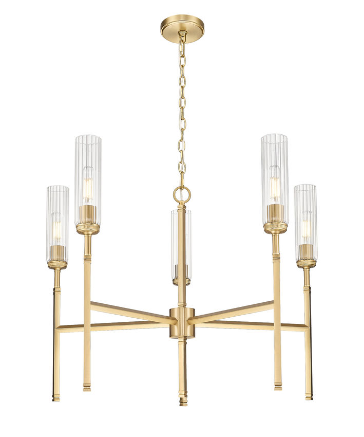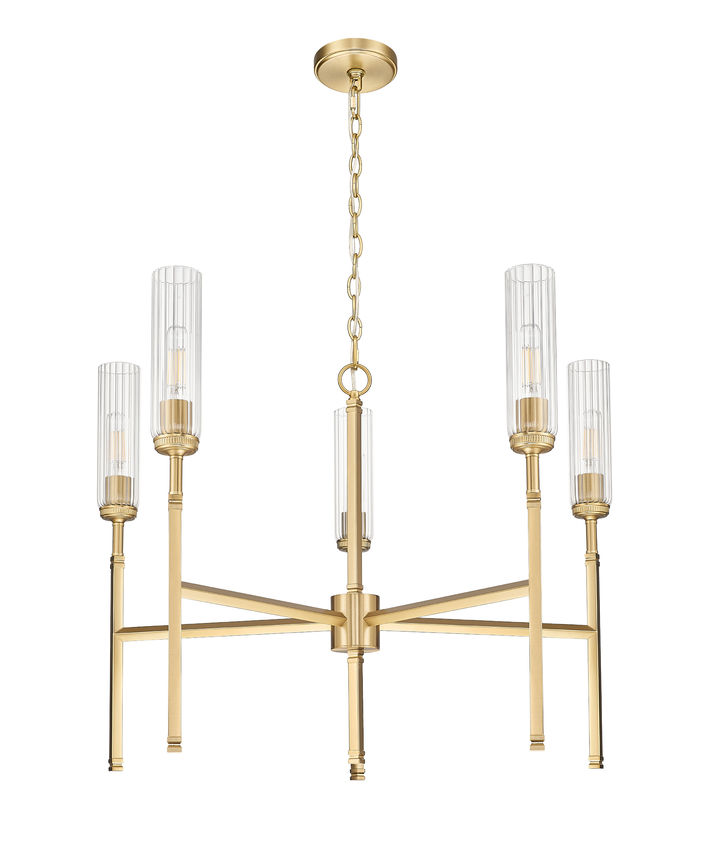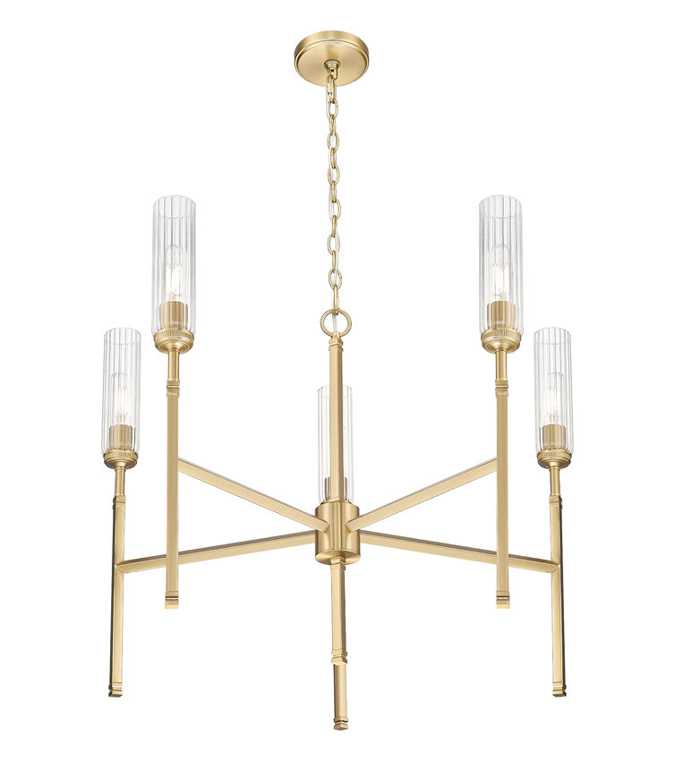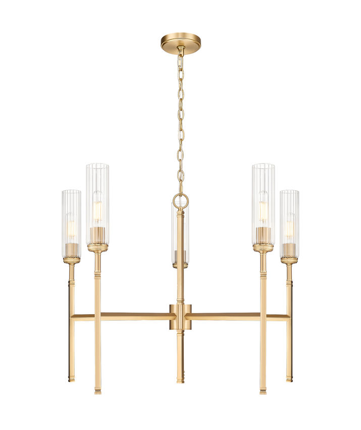 Graceful lines emphasize the compact profile and exceptional style of a modern five-light chandelier. Slim stems and slender fluted glass shades create a champagne flute effect, adding sophisticated sparkle as the glass diffuses illumination and reduces glare to create an inviting ambiance in your living or dining room. Its modern gold finish adds warmth and richness to clean, slim lines, completing the design with robust character and elegance.