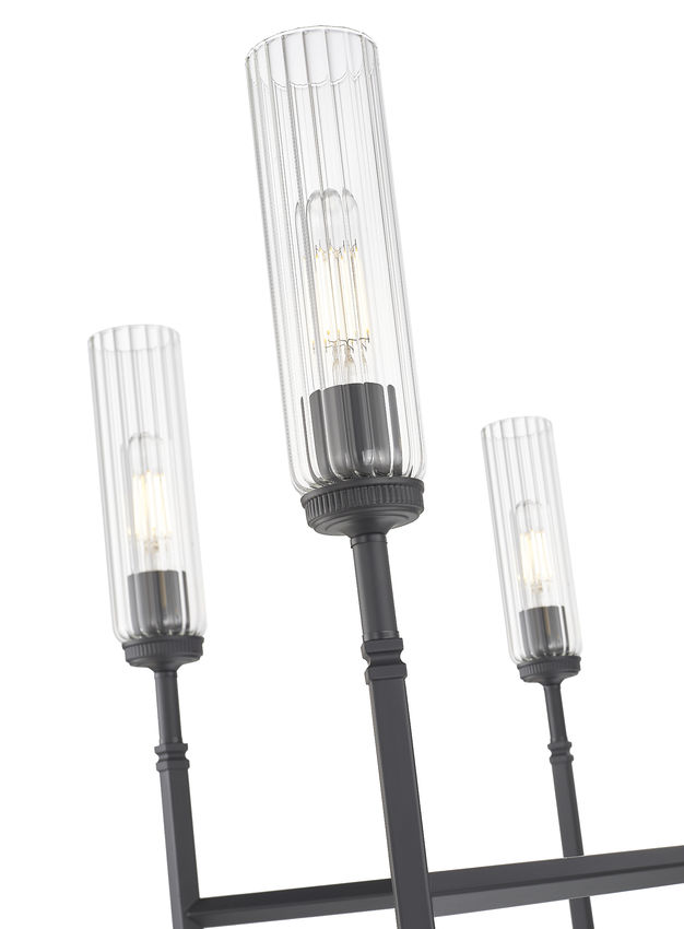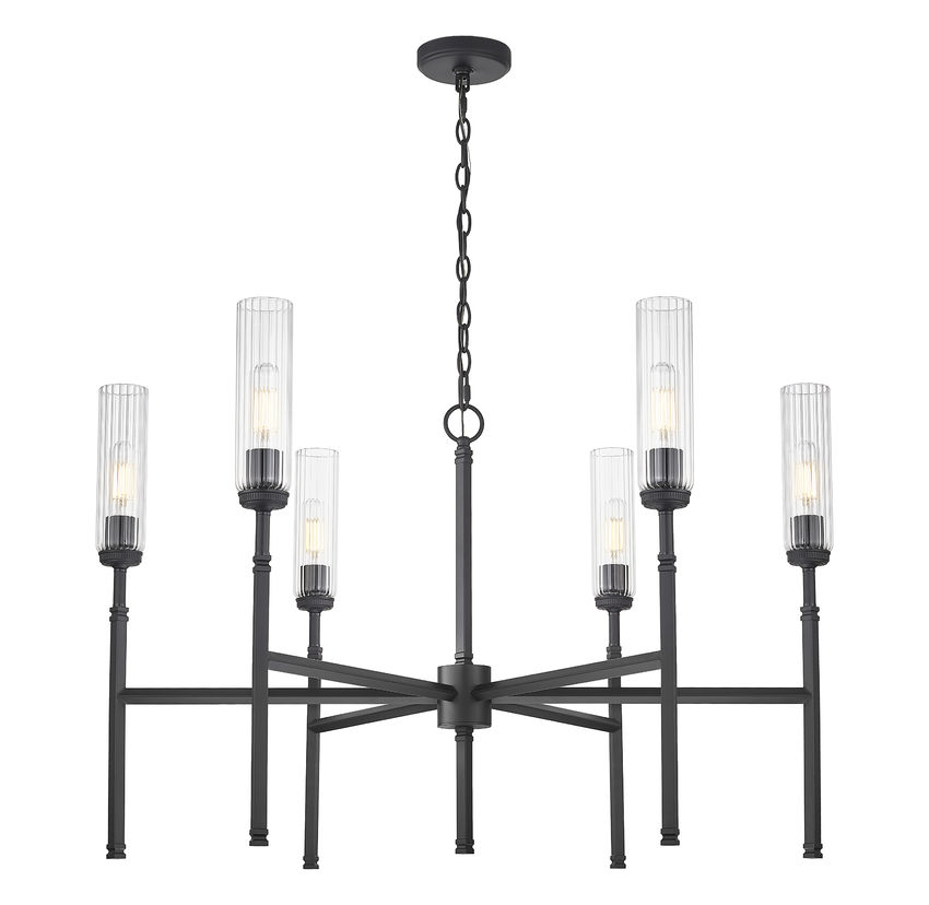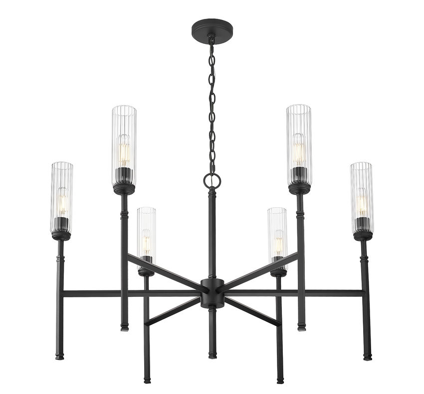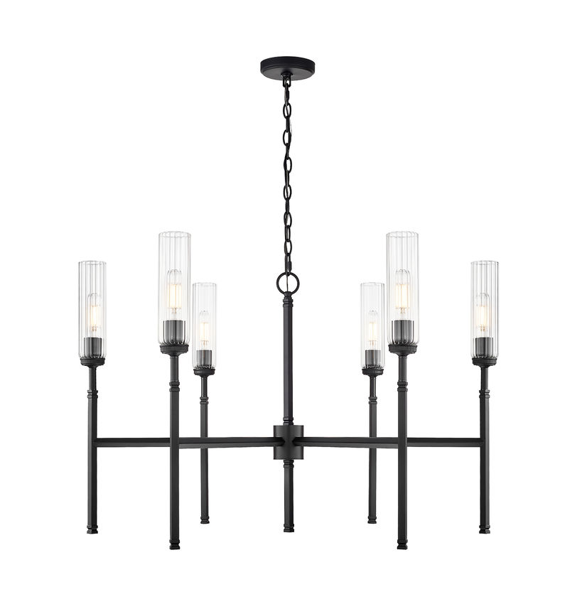 Embrace timeless design with the clean, slim lines and defining matte black finish that decorate this modern six-light chandelier. Each light features a slim stem and tall fluted clear glass shade, evoking a classic champagne flute. The clustered arrangement staggers the light to maintain a compact profile that's just right for living and dining rooms, alike.