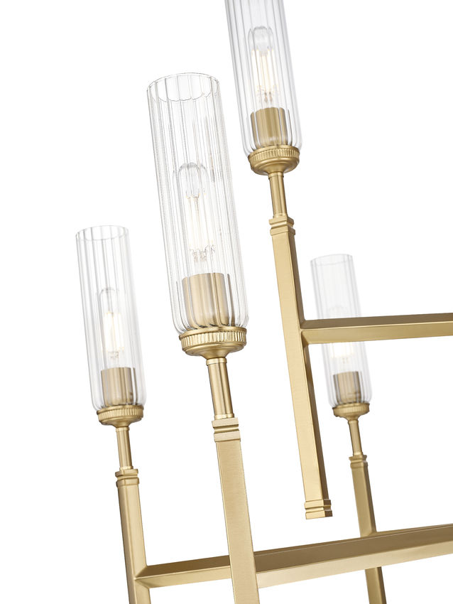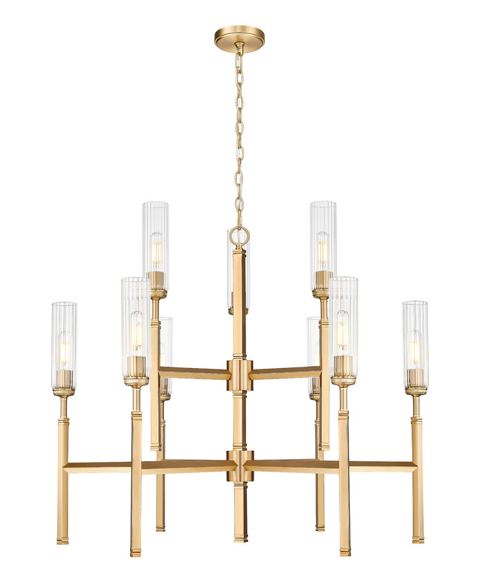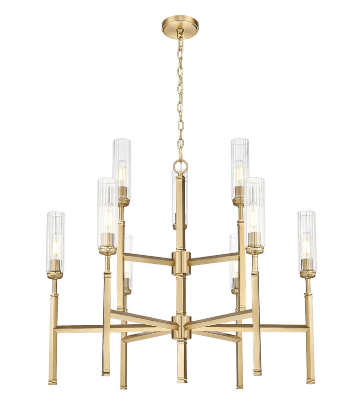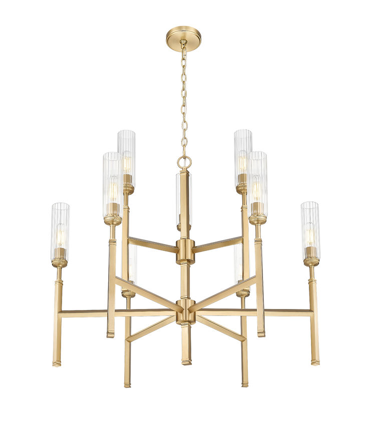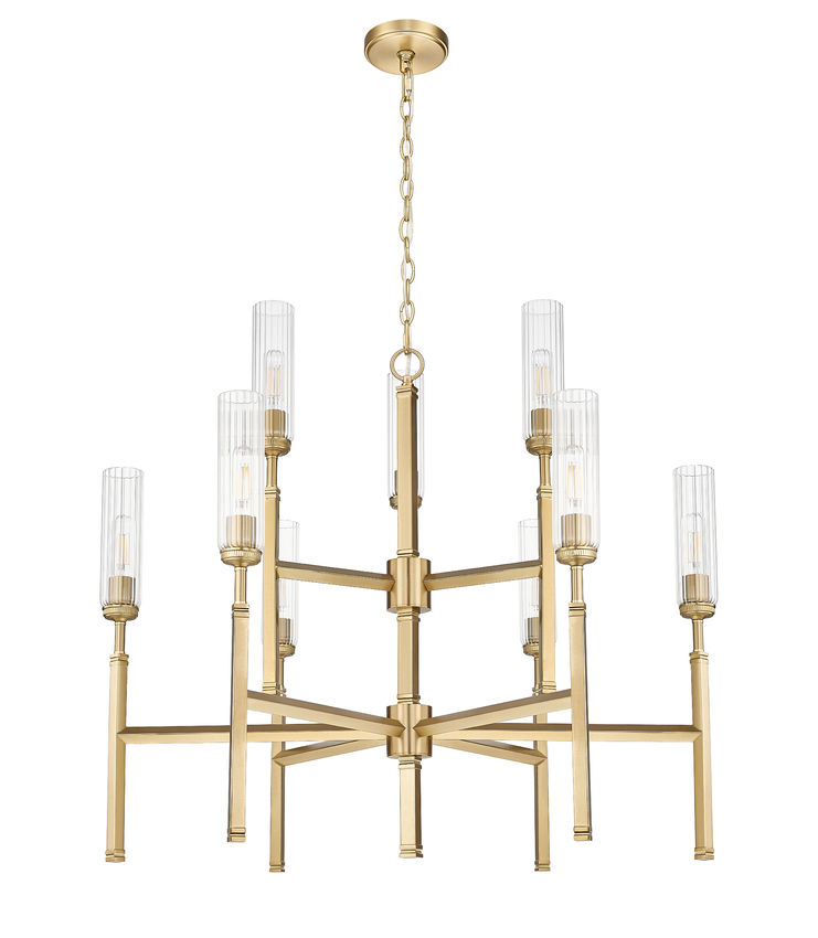 Opt for sophistication with the modern gold finish that embellishes this nine-light chandelier. Its tiered silhouette is bold but compact, ideal for vaulted ceilings and staircases. Clear fluted glass shades reduce glare for excellent ambiance and stand atop slim stems that bring champagne-inspired elegance and personality.