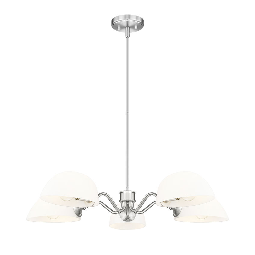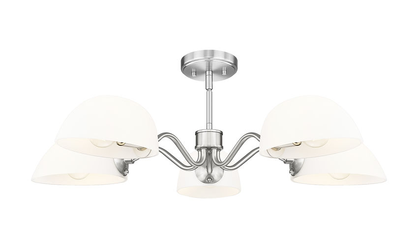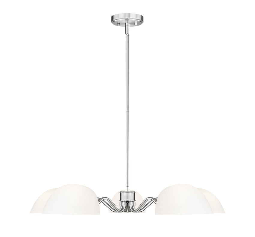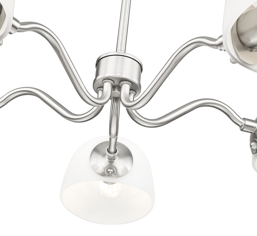 With domed shades that direct light up or down to suit your needs, this modern five-light chandelier is a truly versatile design to complement in a variety of spaces. Opal glass ensures soft, diffuse illumination, while a brushed nickel finish offers timeless elegance and sleek character. Curvy arms complete the look for a stylish fixture that converts to semi-flush for added flexibility in your home.