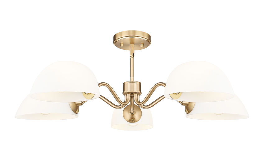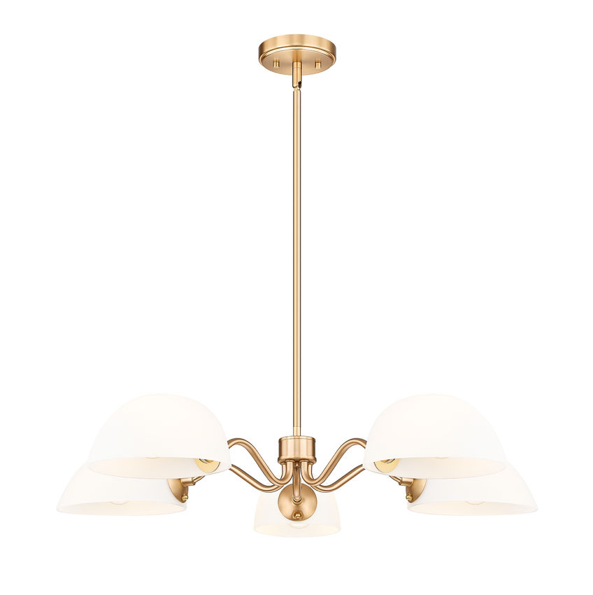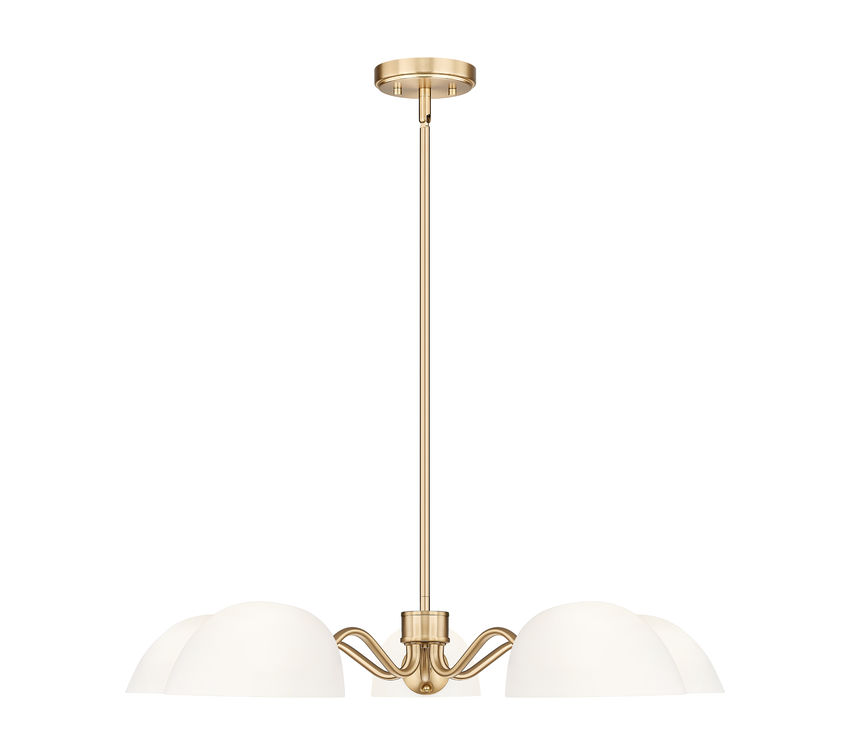 Playful curves add a hint of personality and bubbly energy to this modern five-light chandelier. A versatile addition, it converts to semi-flush and shades can be positioned to cast up or downlighting, offering bespoke elegance in your space. A modern gold frame finish and domed opal glass shades capture a sense of timelessness and radiance that elevates any space.