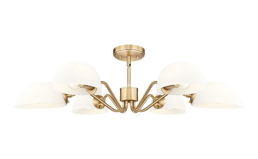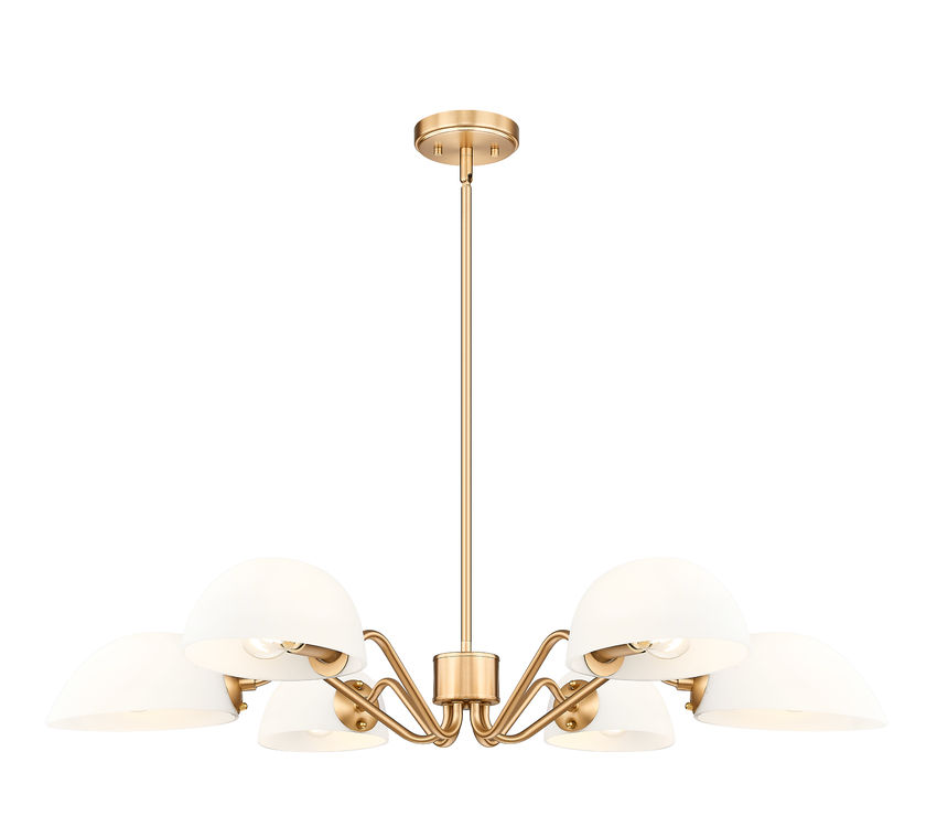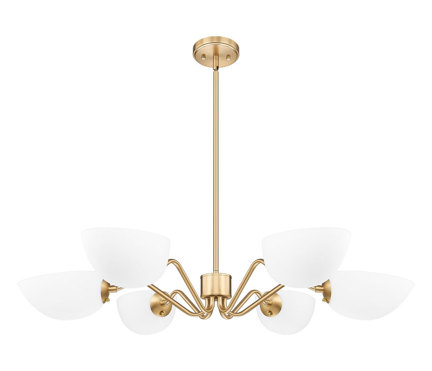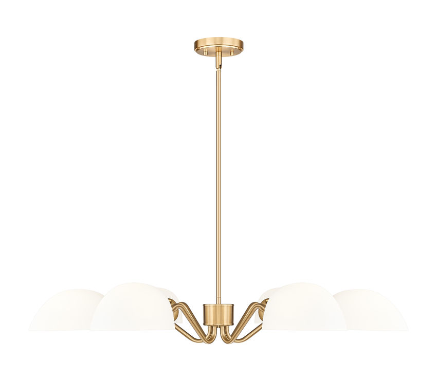 Playful personality shows itself in the curvy arms featured on this modern six-light chandelier. It's a radiant, flexible fixture that casts up or down lighting based on the positioning of its domed opal glass shades. In modern gold, it radiates warmth, elegance and lovely illumination all in the same moment.