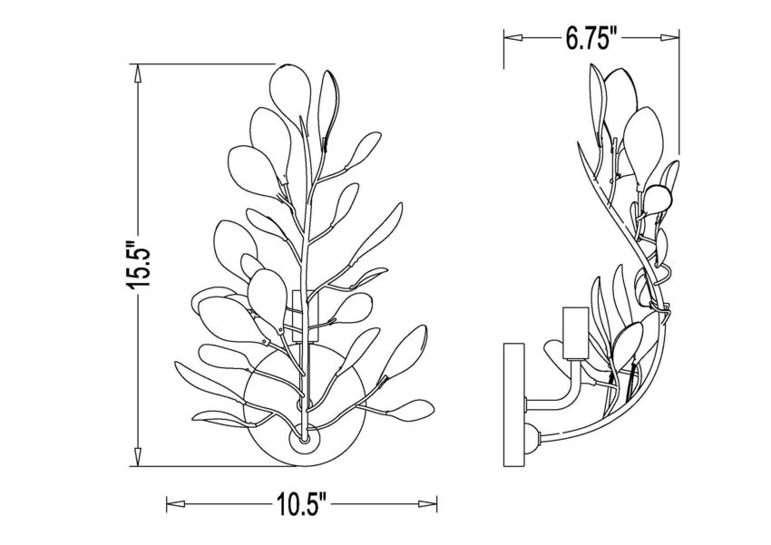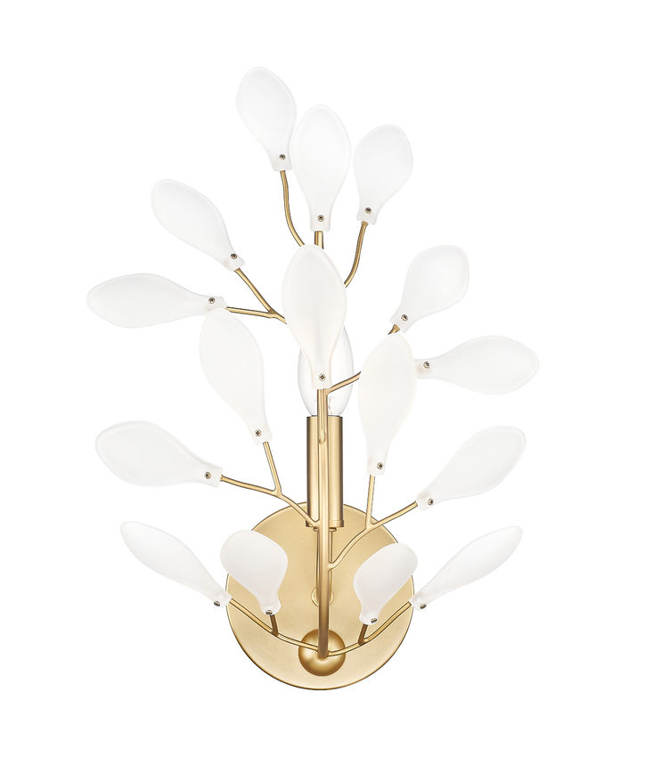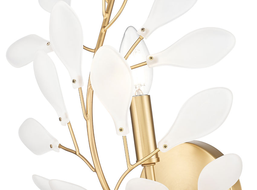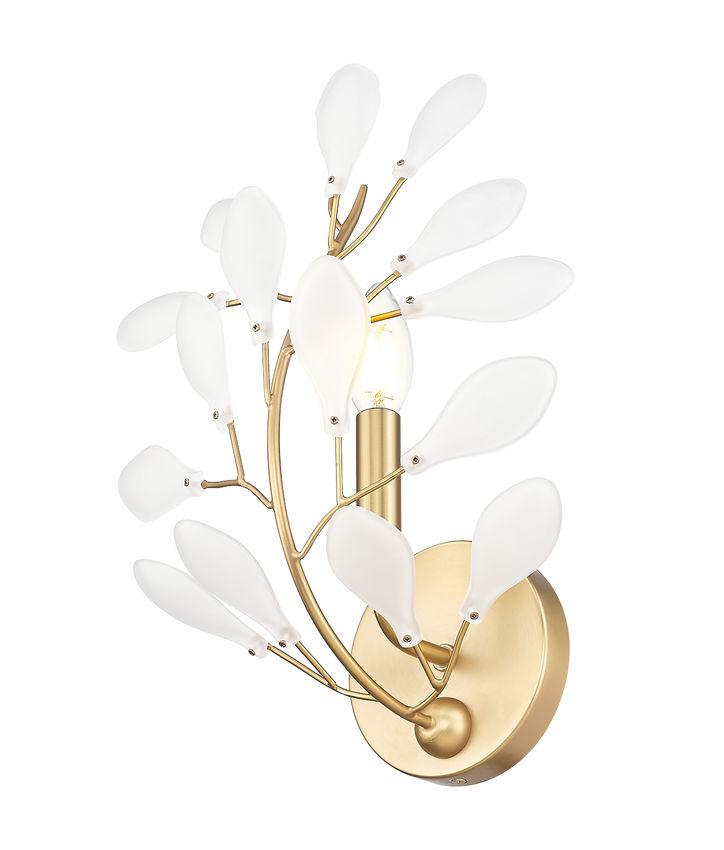 An organic version of botanical beauty, this single-light wall sconce becomes a must-have fixture mixing delicacy with artistry. Modern gold finish steel framing positions a single branch-like element with sparkling crystal buds capturing and reflecting warm illumination. Make this dimmable light part of a custom living room, bedroom, or hallway.