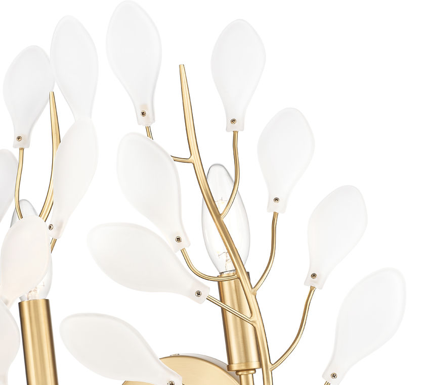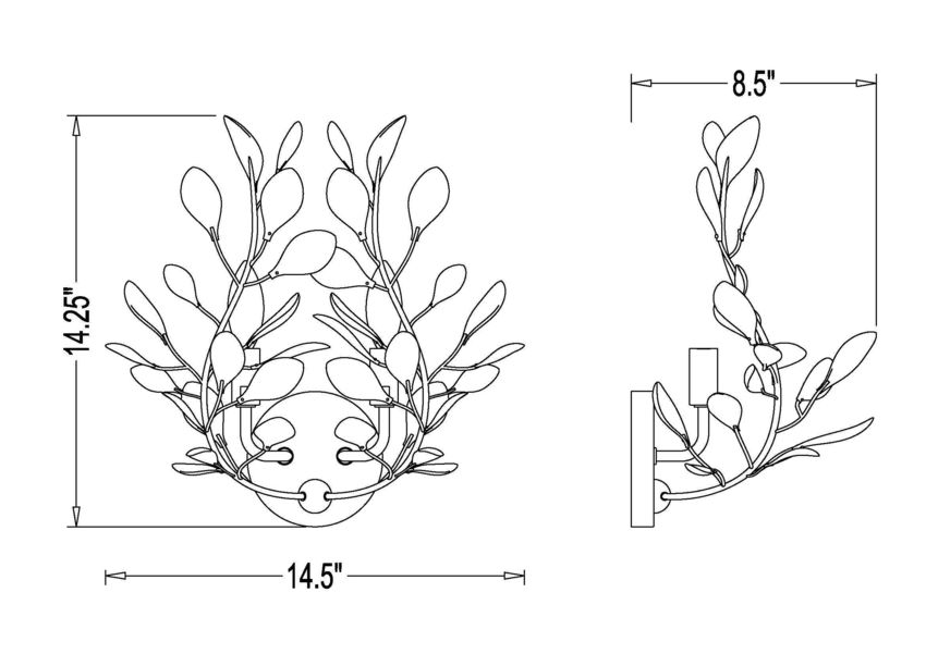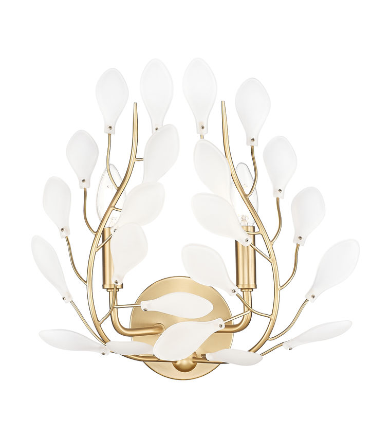 Indulgent botanical flavor shows off the organic beauty of a two-light wall sconce sure to soften and highlight living rooms, bedrooms, and entryways. Count on warm illumination from bud-like crystal elements capping slender modern gold finish branches, with dimmable light levels creating customized mood lighting.