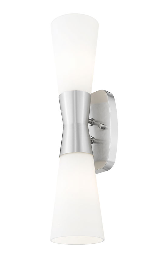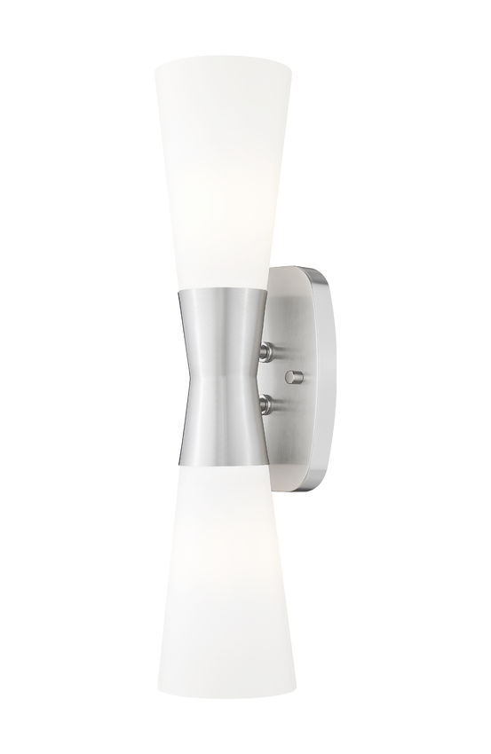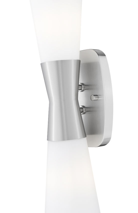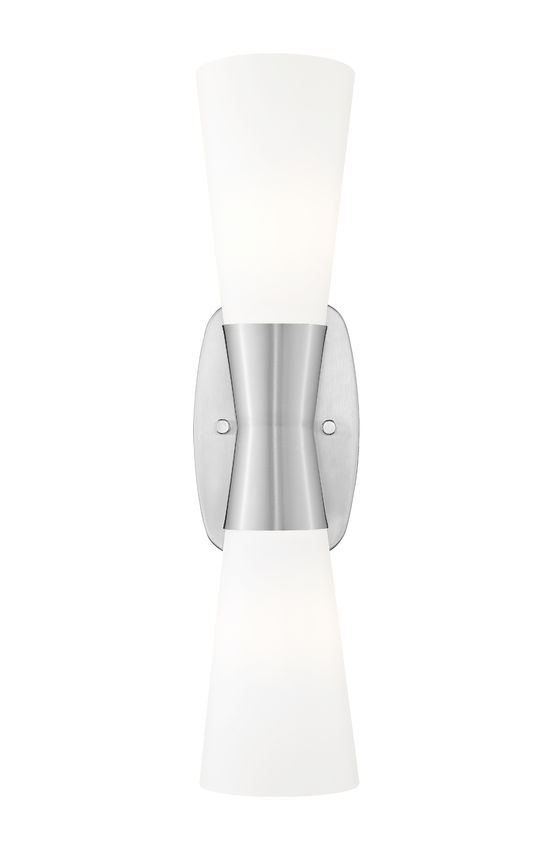 Proportionality and a deco feel bring a stylish look to this two-light wall sconce, a superb choice for most settings. An hourglass silhouette blends brushed nickel finish steel framing with a cinched center, as inverted matte opal glass shades point upward and downward to illuminate living rooms, dining rooms, and bedrooms. Dimming features customize light level delivery to deliver mood-altering glow and conform to time-of-day needs.