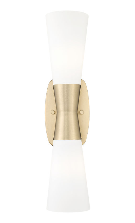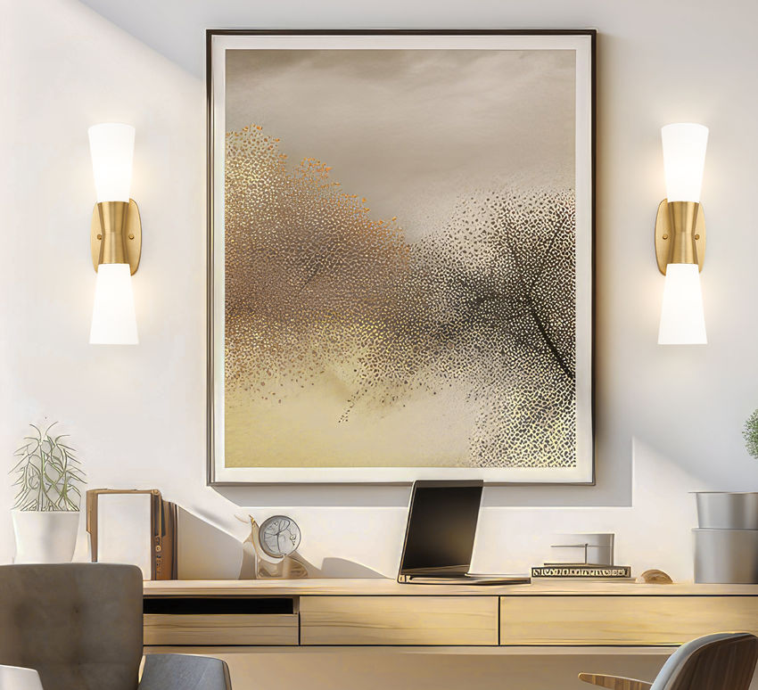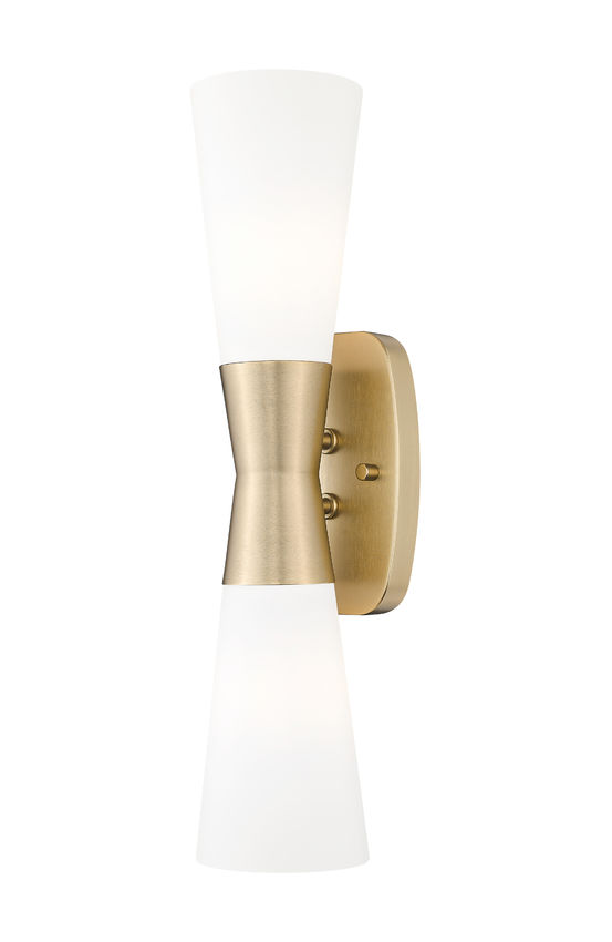 A mix of design motifs brings elegance and versatility to a two-light wall sconce you'll love. Start with inverted, vertically placed matte opal glass contoured shades, chic and delicate. Continue to a beautiful modern gold finish metal frame configuration forming an hourglass silhouette.