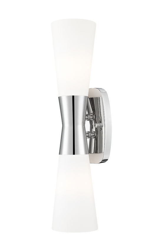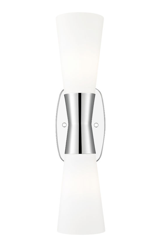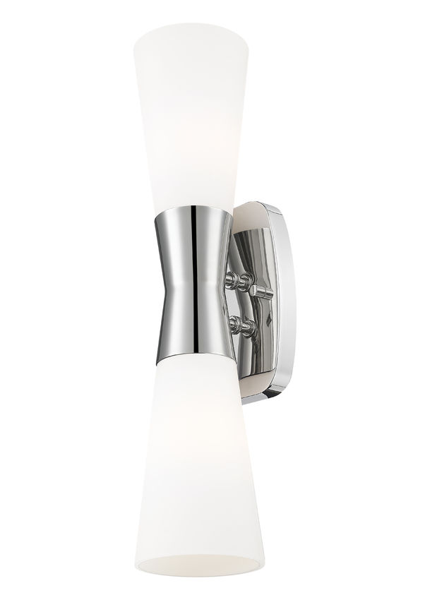 Borrowing from a slight deco design motif, this two-light wall sconce delivers both versatility and elegance. This metal and glass fixture reflects timeless style with a wall mount and cinched center holder made of brilliant polished nickel finish steel, with inverted contoured matte opal glass shades complementing living rooms, doorways, and dining spaces. Add the option to dim light levels, and this fixture is a winning choice.