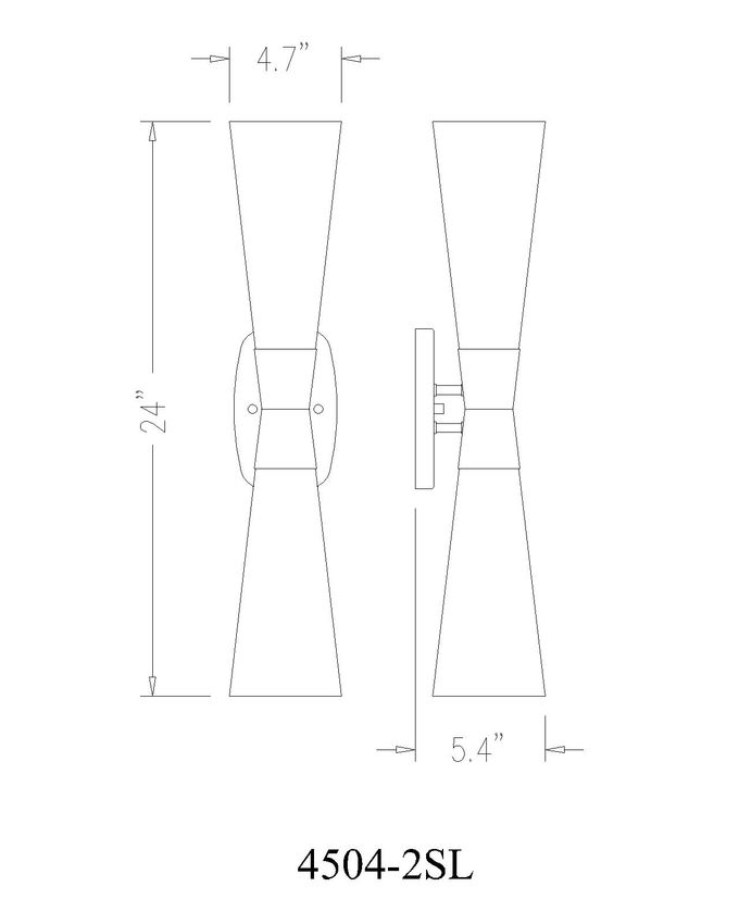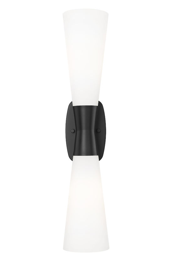 An attractive vertical orientation delivers an hourglass silhouette in a two-light wall sconce with a superb contrasting palette. Urban and deco motifs blend in a fixture crafted with matte black steel framing, including a chic cinched center holder. Tall matte opal glass tapered shades invert to distribute dimmable lighting evenly.