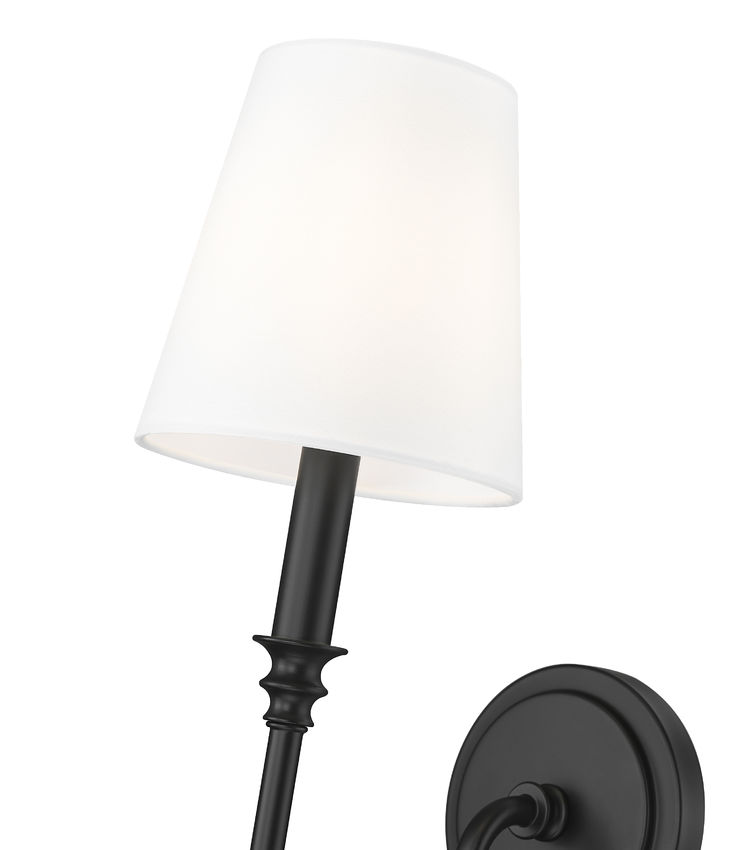 Follow the captivating curvature adding elegance to this one-light wall sconce, an exceptional fixture for bedrooms, living rooms, and hallways. Matte black finish steel framing creates a sleek silhouette with a deep bend in its arm and a prominent circular wall mount. A classic linen shade filters lighting with dimming features to control lighting levels.