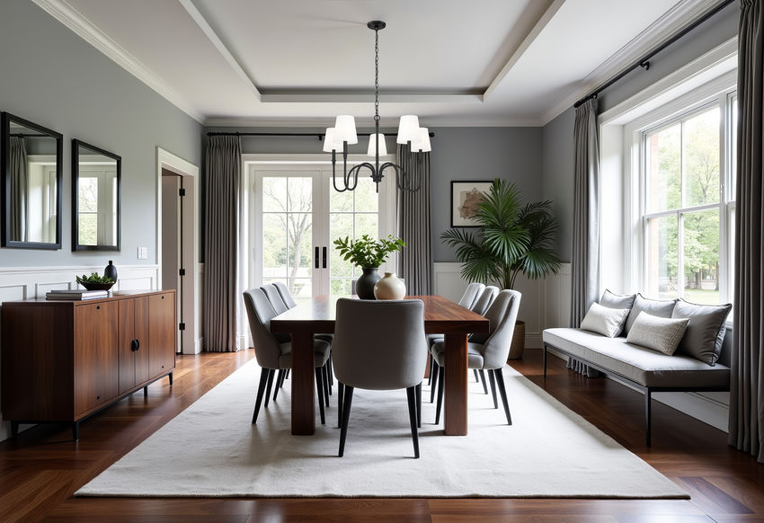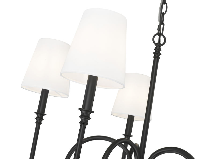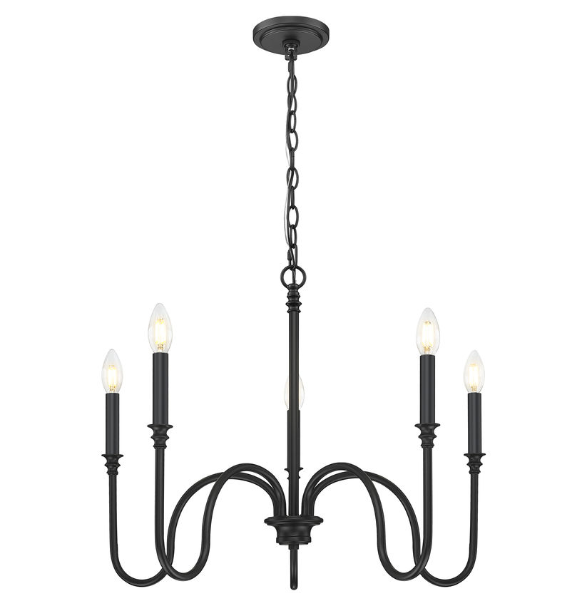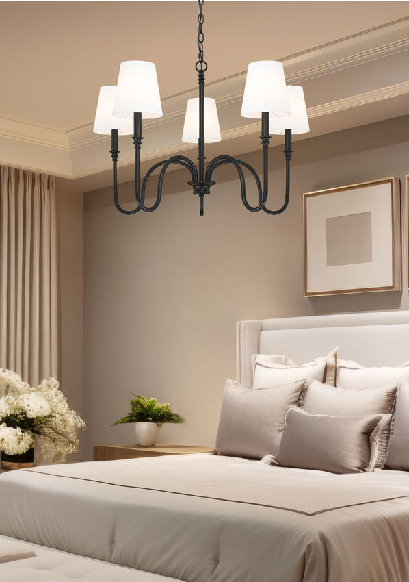 Pronounced curves bring a visual treat as this five-light chandelier offers a mix of minimalism with sleek silhouetting. Matte black finish steel framing adds an airy aesthetic with curved arms support subtly accented candelabra holders, and classic tapered linen shades filter light in dining rooms and foyers. Dimming functions create variable light levels to conform to time-of-day conditions.