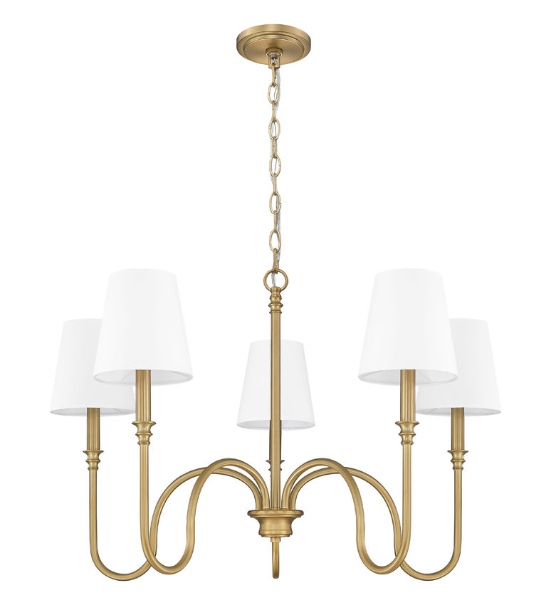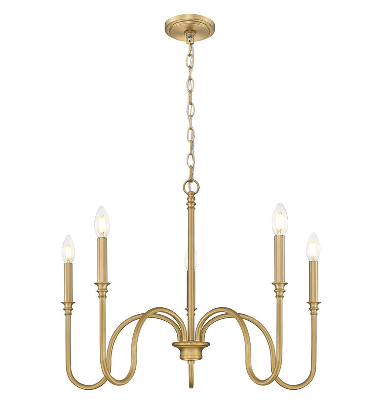 Visually enticing with an alluring silhouette, this five-light chandelier makes itself a key element in dining spaces, living rooms, and foyers. Warm rubbed brass finish steel construction offers an airy look with spaced arms showing dramatic curving, ending with subtle detail and candelabra holders. This glam fixture is dimmable to adjust lighting levels for disparate needs.