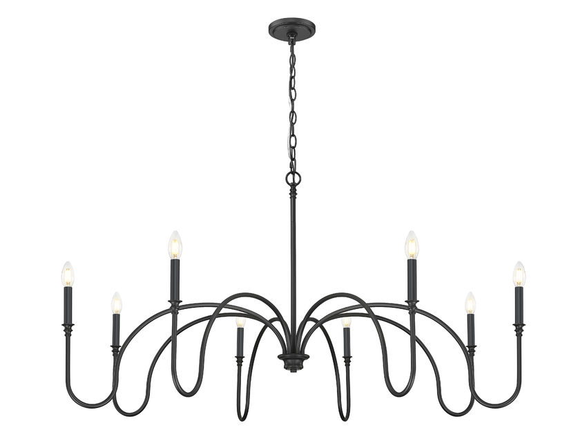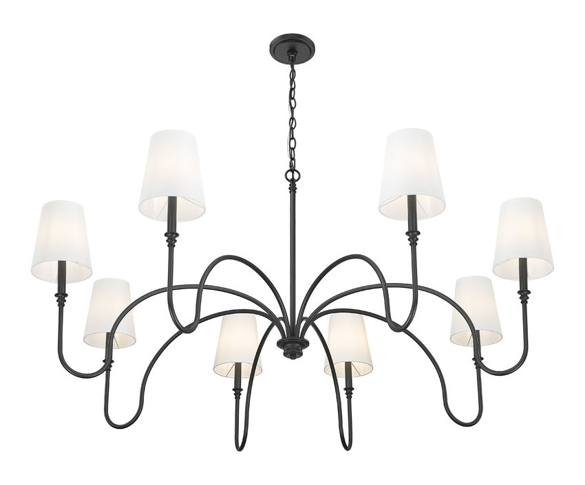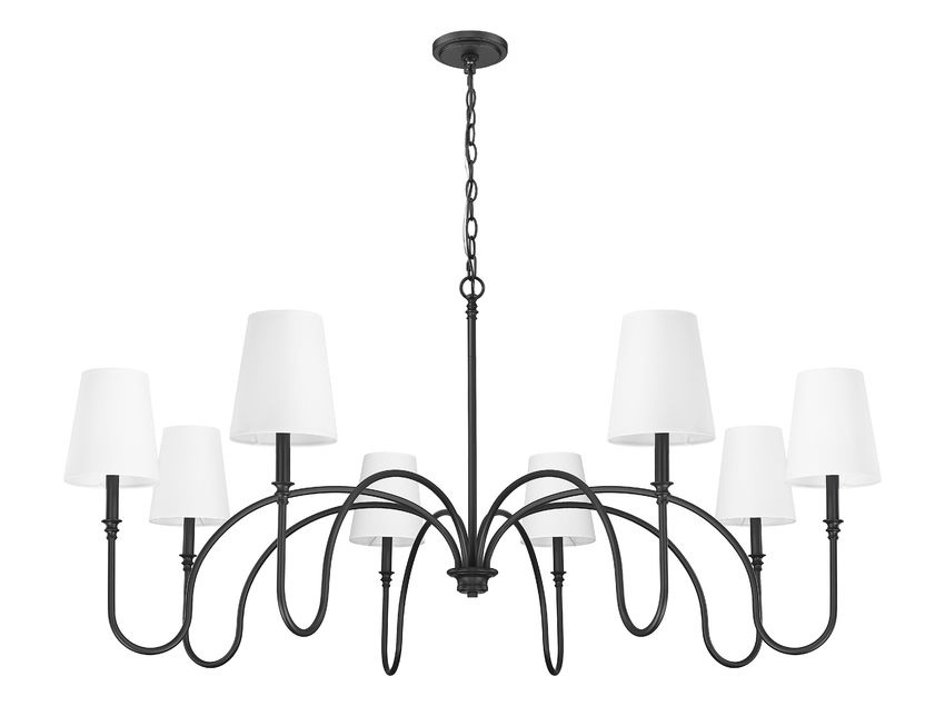 Dramatically curved arms create an open-air look to this eight-light chandelier that flatters large living and dining spaces. Bold matte black finish steel and pale linen shades bring custom contrast to a fixture with romantic silhouetting. Dimming features allow for mood lighting and time-of-day illumination needs.