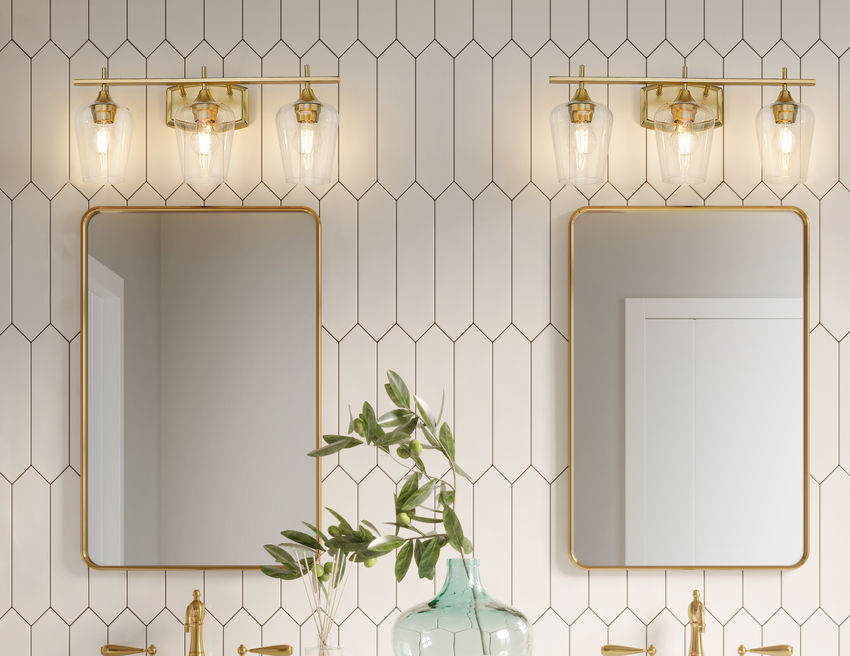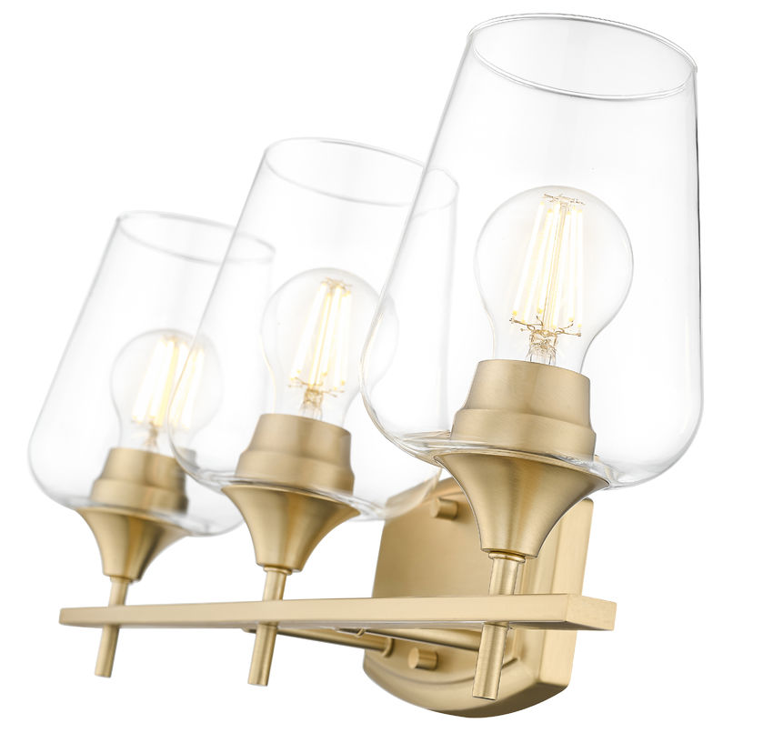 A classic design places delicate clear glass goblet shades in a linear configuration, tempting and elegant as a three-light vanity light perfect for both bath spaces and living areas. Warm burnished brass finish steel framing offers subtle detail, including a shapely wall mount and holders. This dimmable light fixture adds functional elements for custom light levels.