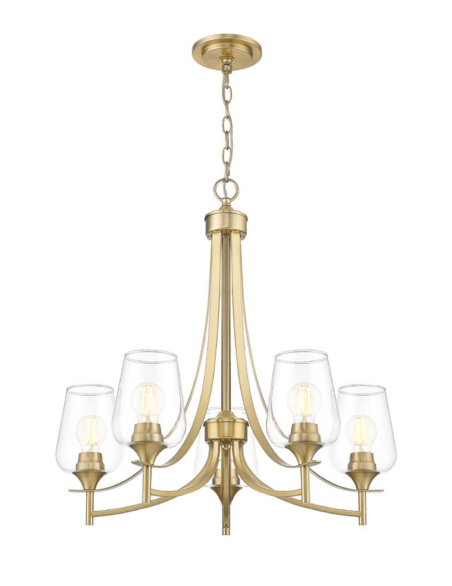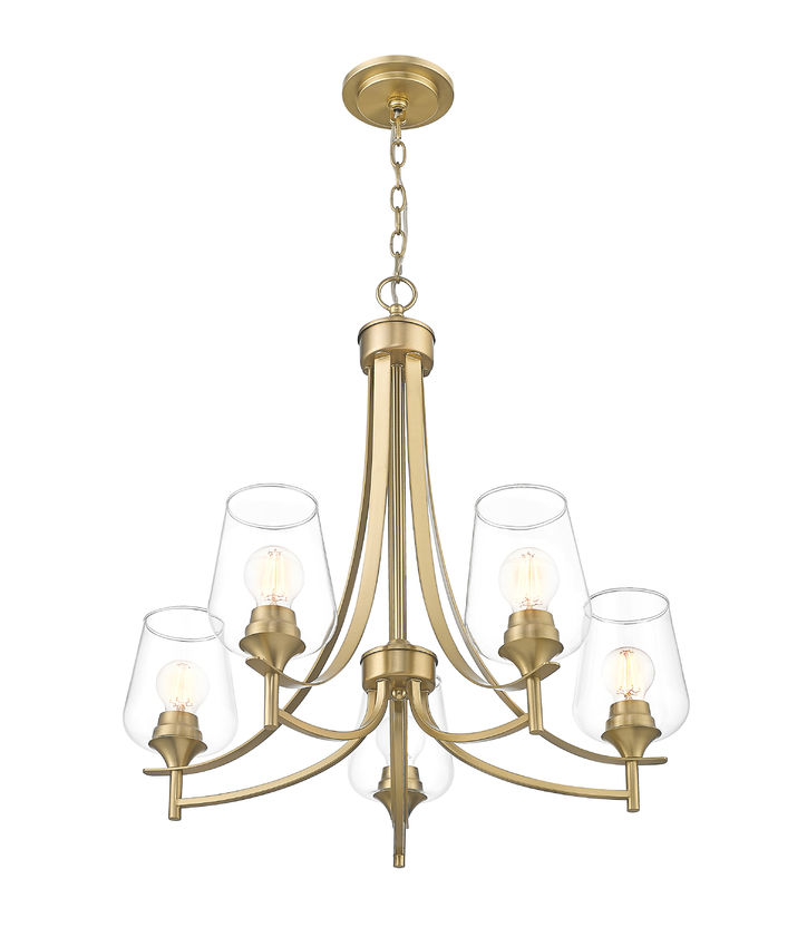 Light up a dining room or foyer with a classically elegant five-light chandelier delivering symmetry and breathtaking style. Crafted of burnished brass finish steel, its multi-part framing adds an open motif with deliciously subtle curved arms supporting delicate clear glass goblet shades. Place this dimmable fixture over dining ensembles, in living areas, and in entryways.