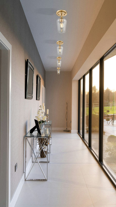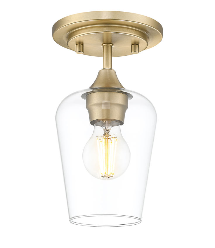Tempting delicacy offers a single-light flush mount ceiling light attracting admiration from floor to ceiling. An inverted clear glass goblet shade filters soft, dimmable illumination as it contributes to a truly artisan craftsman motif. Subtle accents on its burnished brass finish steel framing lift a dramatic motif perfect for modern or transitional bathrooms, bedrooms, kitchens, and dining spaces.