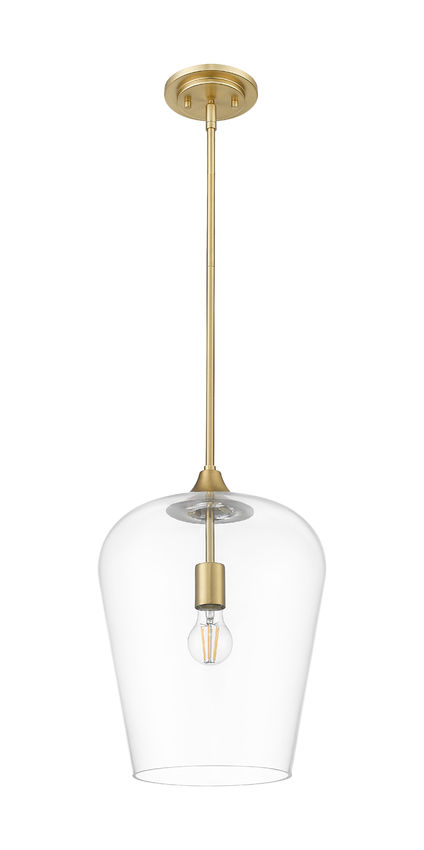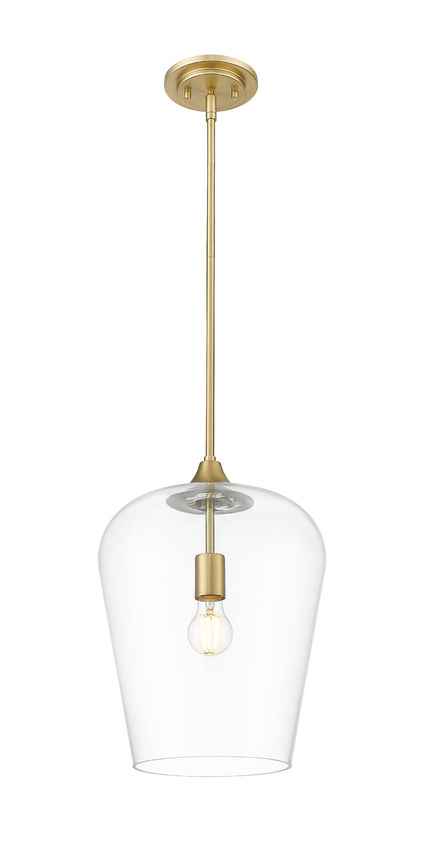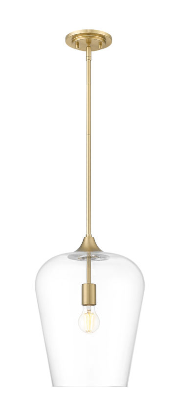 Make this single-light glass and metal pendant a staple in any setting, drawing on its sophisticated motif and lush finish. Steel construction coated with burnished brass tones reflects simplicity as it suspends an inverted clear glass goblet shade filtering dimmable light and illuminating a corner living space or bedroom.