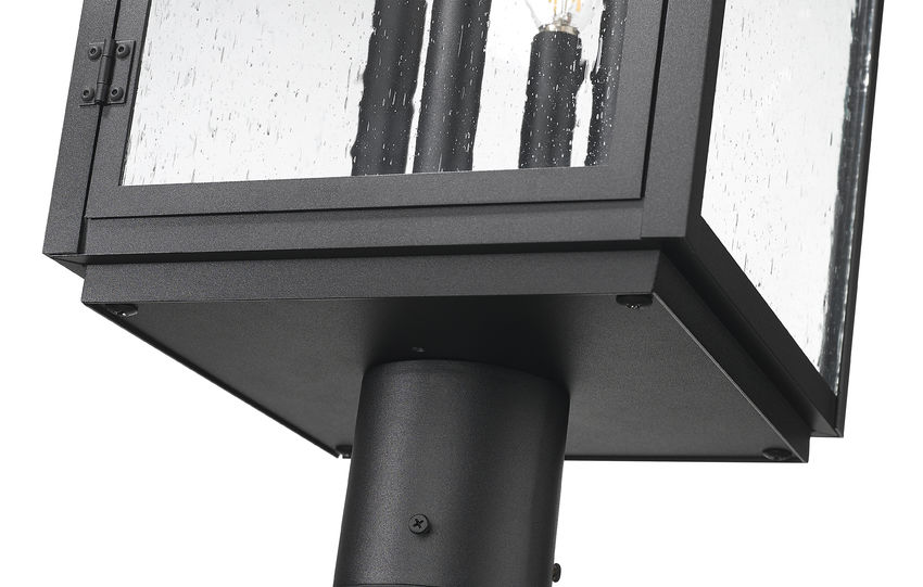 Put finishing touches on a farmhouse or industrial exterior with this Mission four-light outdoor post mount fixture. Delivering impeccable curb appeal, it's bright illumination shines through panes of clear seedy glass, creating a touch of texture and depth along a walkway or in the garden. A sand black finish adds texture and depth while standing up to the elements.