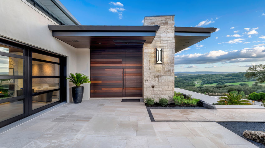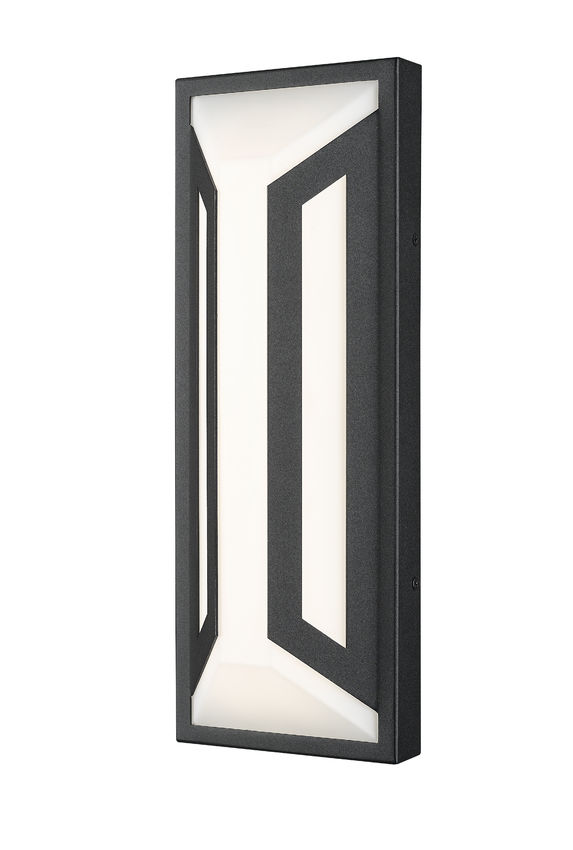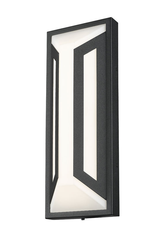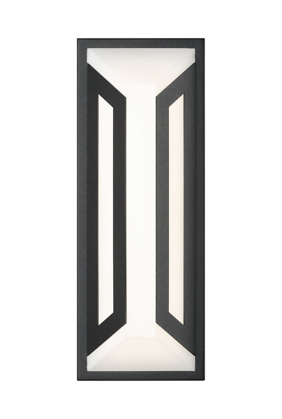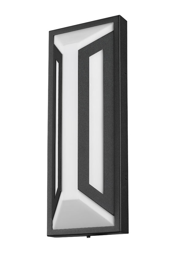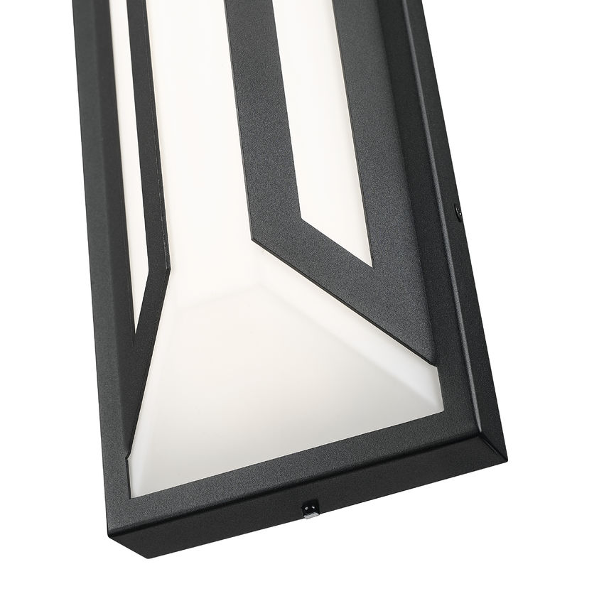 A dramatic contrast and matching design motif create a statement-making impact in exterior spaces with a two-light outdoor wall light you'll admire. Clean lines and angles embellish framing of matte black finish aluminum, with a soft white glass shade glowing with dimmable LED lighting, perfect for daytime and nighttime entertaining in back patio settings and pool houses.